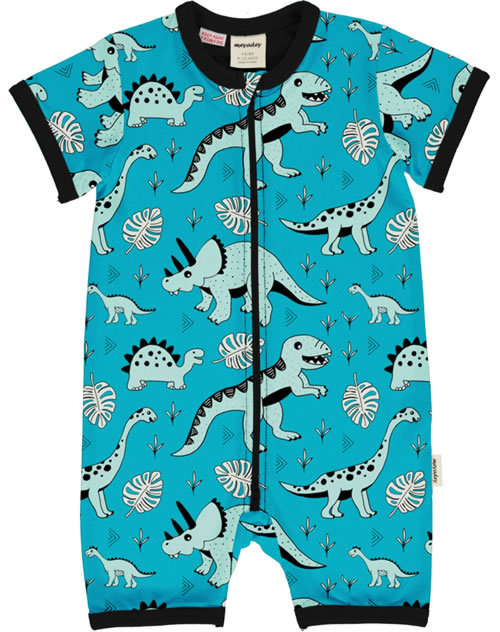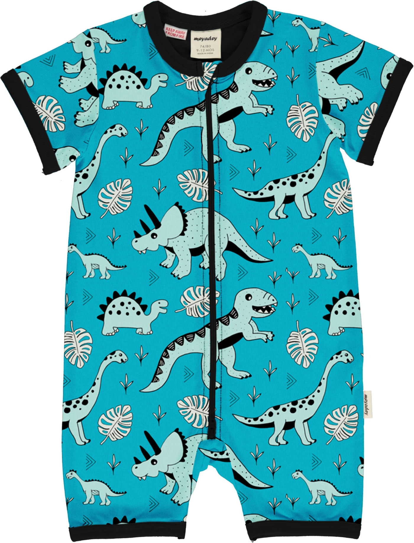 Toller Spieler mit kurzen Armen und Beinen in blau mit Dino-Muster von MEYADEY für Jungen. Ein schöner Kontrast sind die farblich abgesetzten Nähte und der lange Reißverschluss auf der Vorderseite, der das An- und Ausziehen zu einem Kinderspiel macht. Das weiche Material bietet einen hohen Tragekomfort.