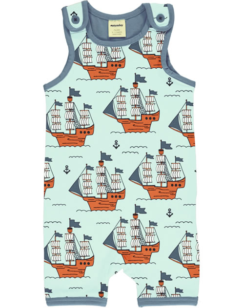 Toller Baby-Spieler mit kurzen Beinen in blau mit Piraten-Motiv von MEYADEY für Jungen und Mädchen. Abgesetze Säume und das Futter in grün sorgen für einen schönen Farbkontrast. Die Knöpfe an den Trägern machen das An- und Ausziehen zu einem Kinderspiel. Das weiche Material bietet einen hohen Tragekomfort.