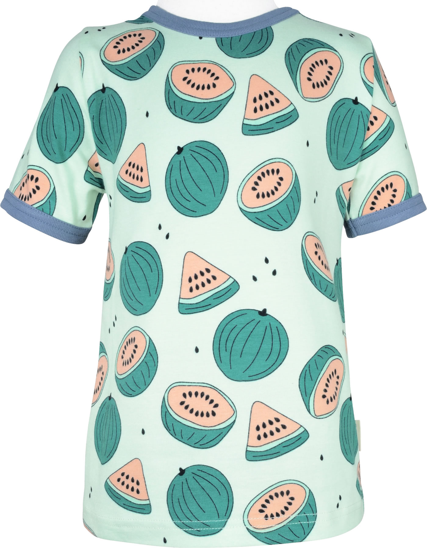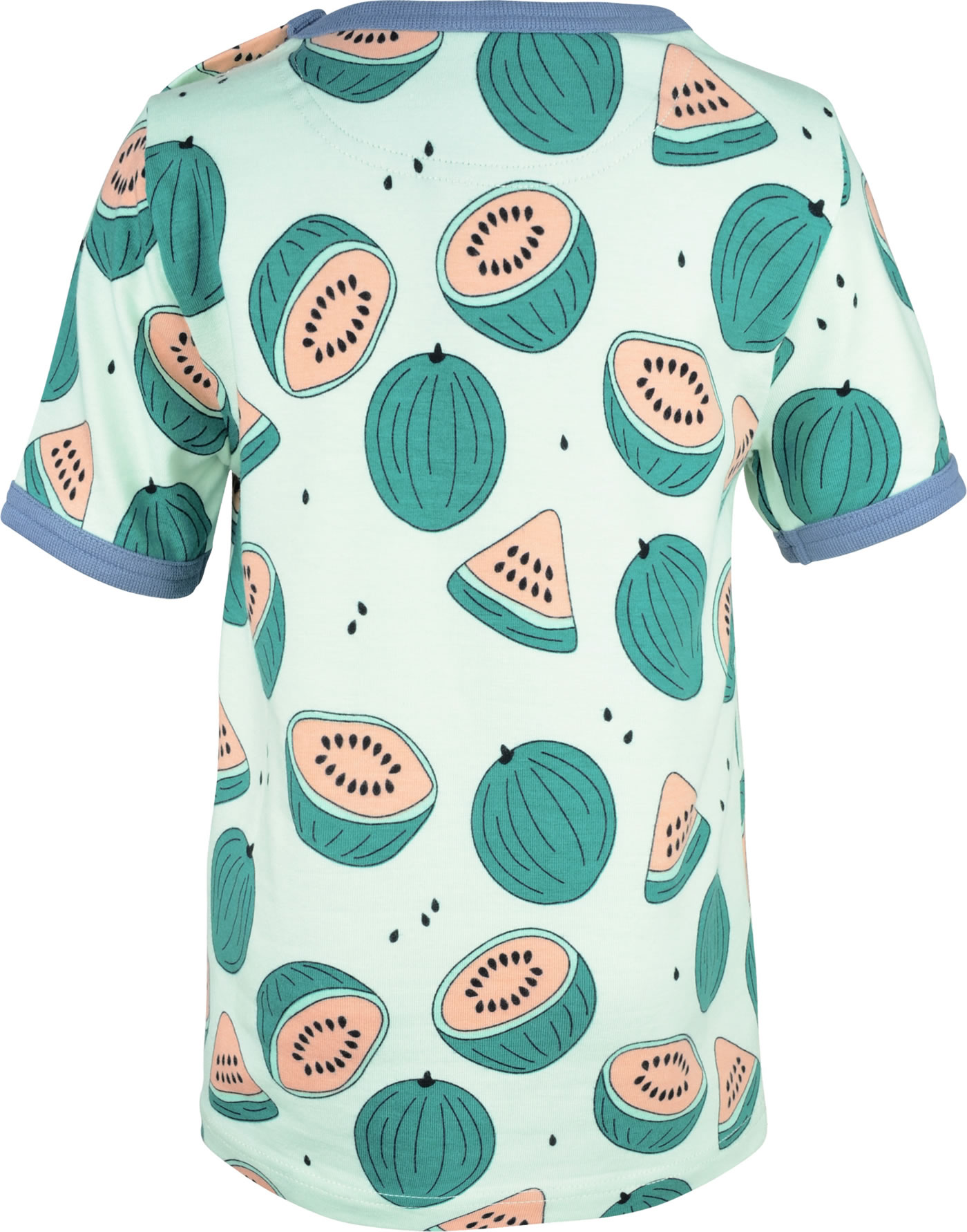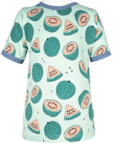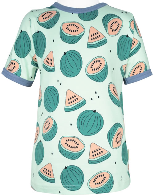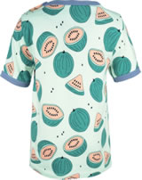 T-Shirt in grün mit kurzen Ärmeln und fröhlichem Wassermelonen-Motiv von MEYADEY. Ein schönes Detail sind die farblich abgesetzten Bündchen. Der gerade Schnitt und das weiche Material sorgen für einen hohen Tragekomfort. Ab Größe 98/104 ohne Druckknöpfe am Halsausschnitt.