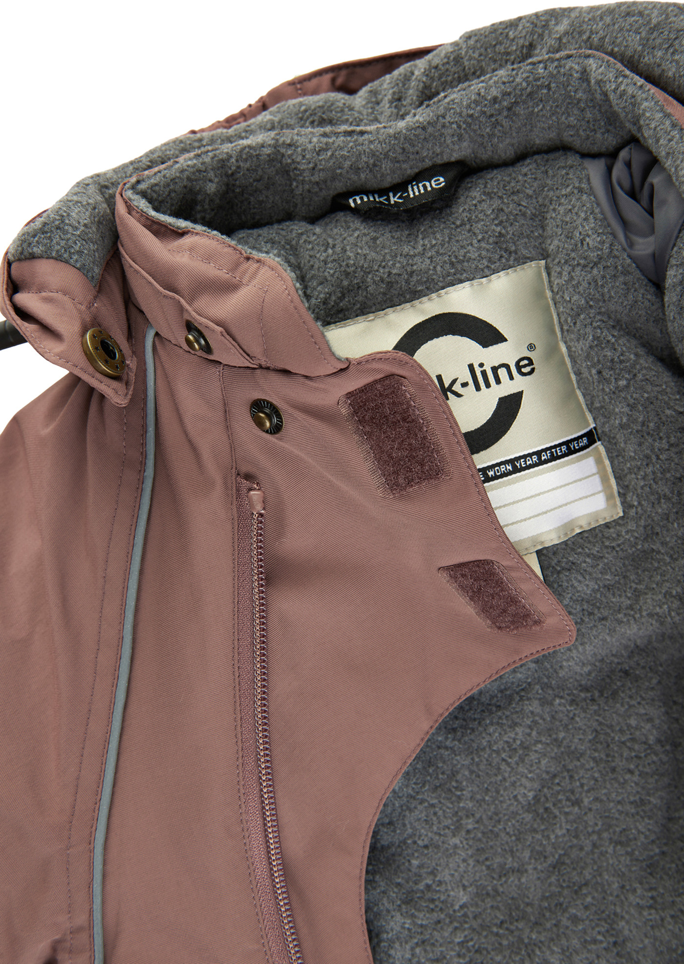 Warm gefütterter Baby-Winteroverall von MIKK-LINE mit abnehmbarer Kapuze und reflektierenden Details.
