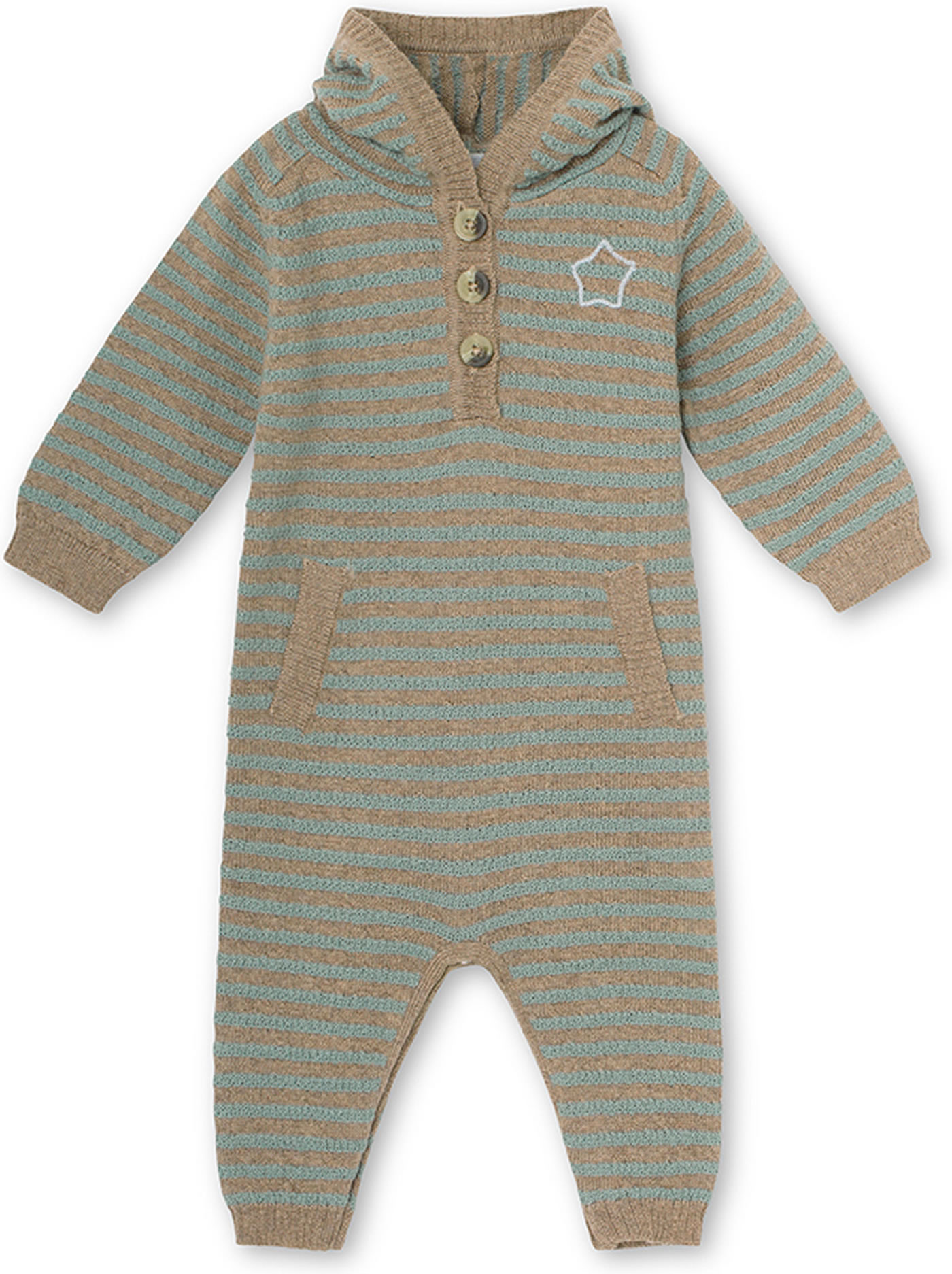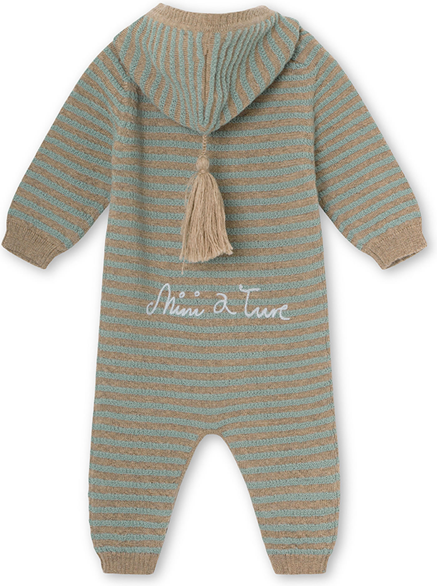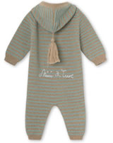 Der schöne Strick-Overall aus Merinowolle in Streifenoptik von MINI A TURE ist ein toller Hingucker mit vielen Details: die Kapuze hat einen Toddel und auf der Rückseite sowie auf der Vorderseite befindet sich eine hübsche Stickerei in einer Kontrastfarbe. Mit angedeuteter Känguru-Tasche und Perlmuttknöpfen ist der Overall in grün und braun gestreift ein besonderes Kleidungsstück für die Kleinsten.