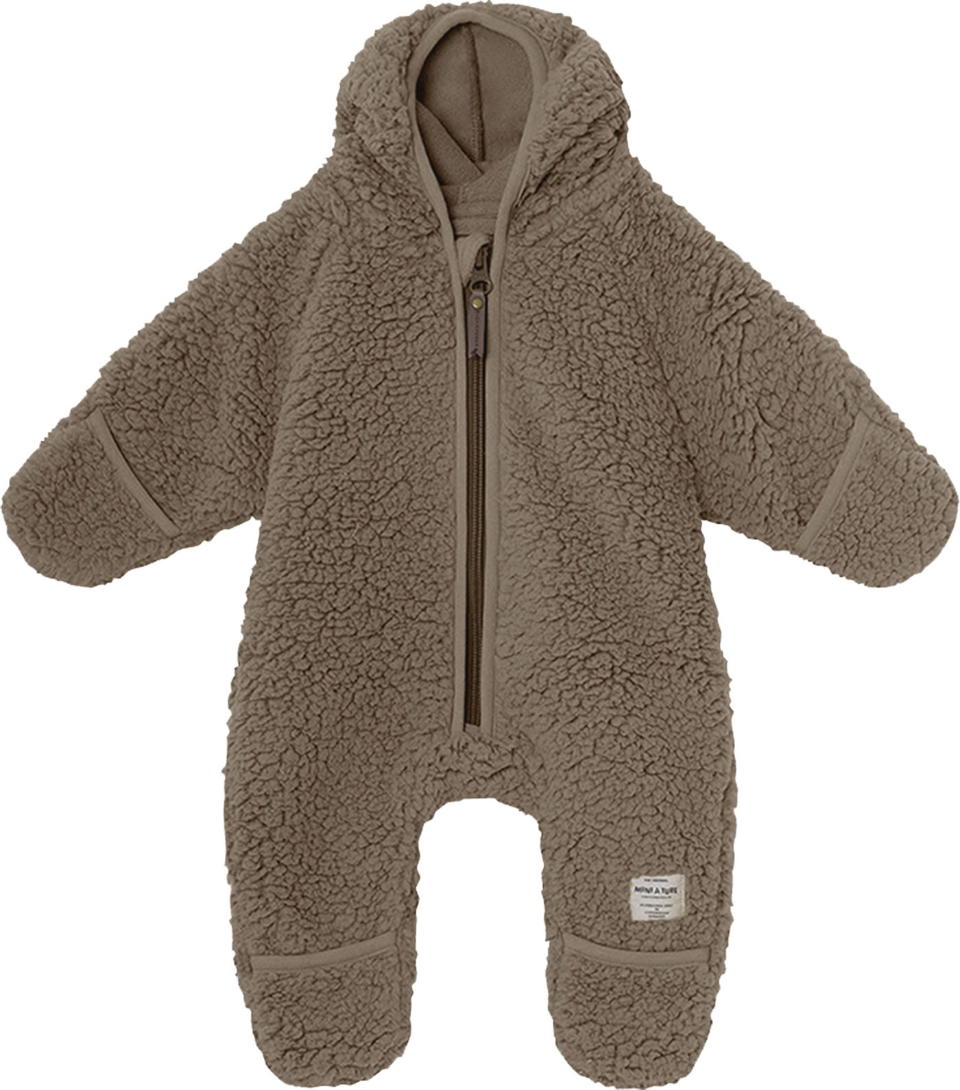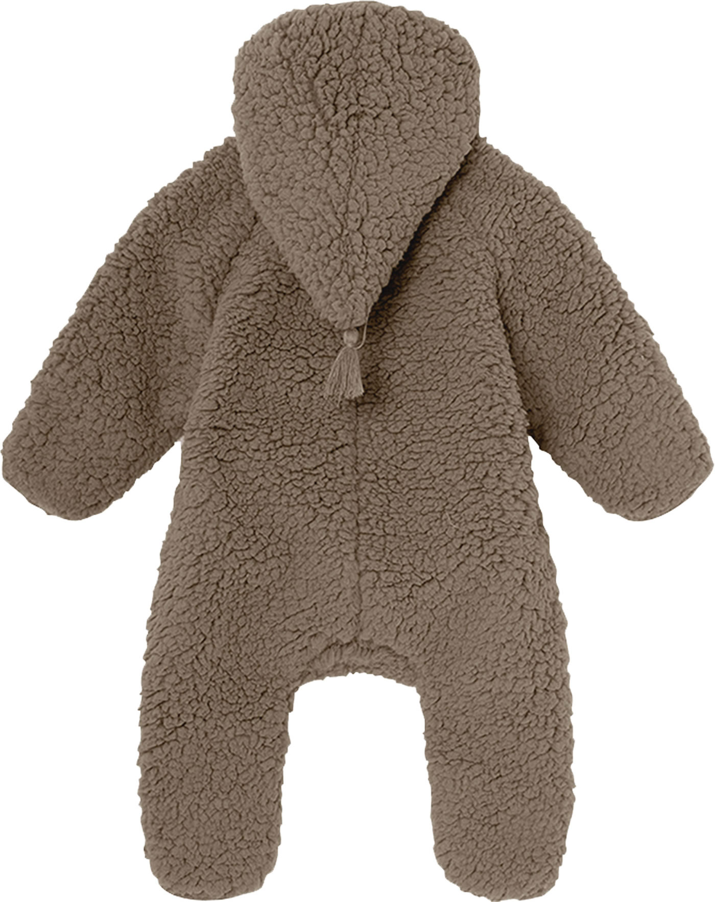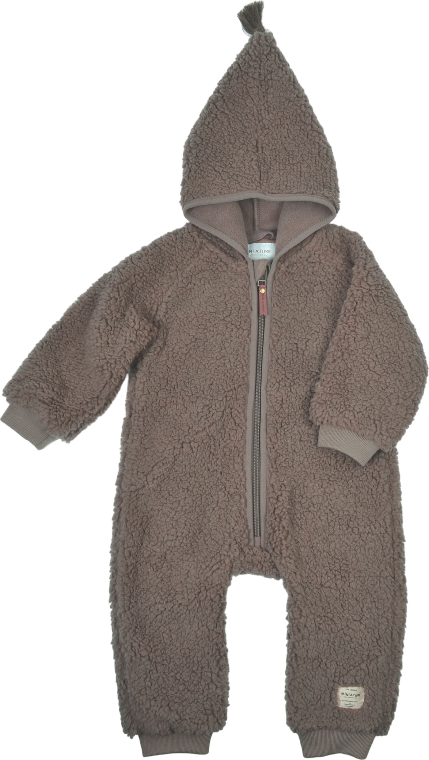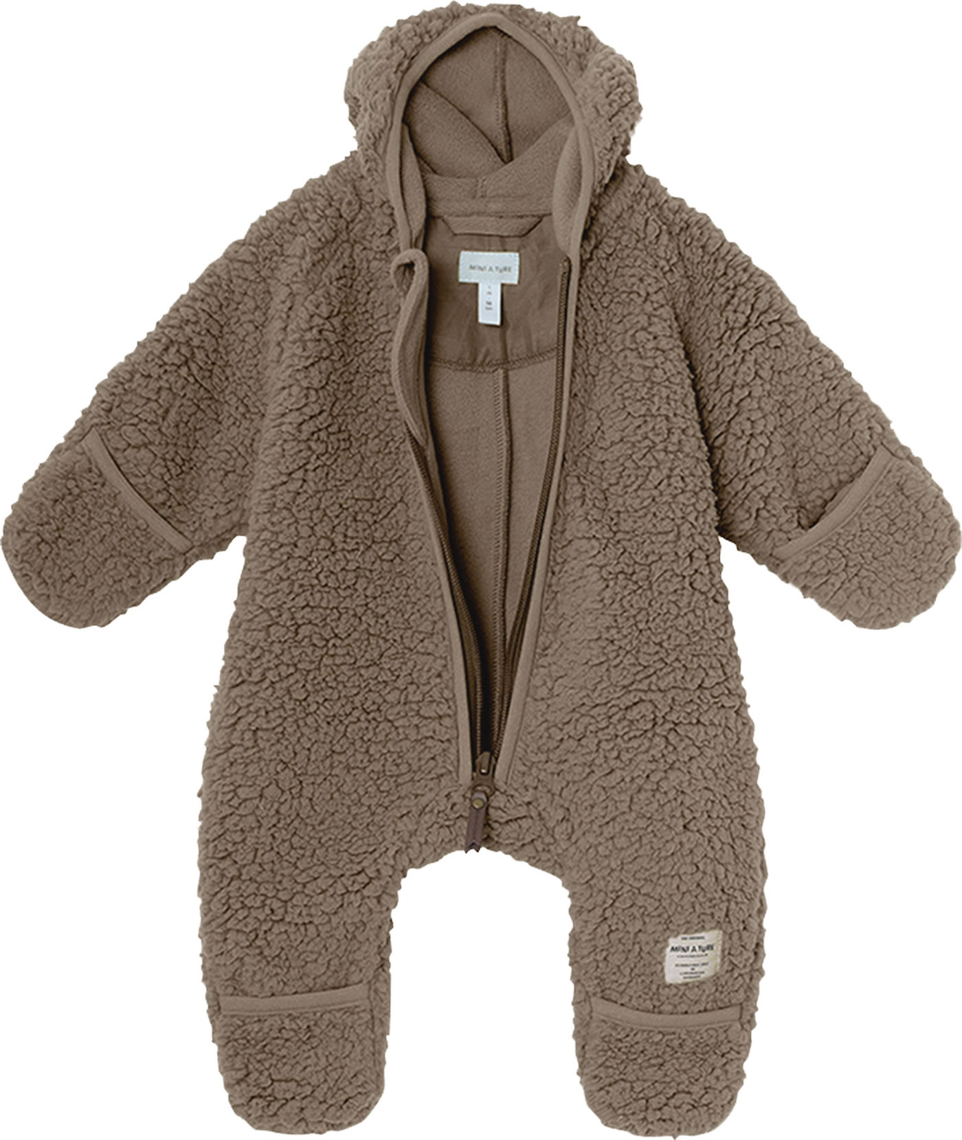 Der kuschelige Teddy-Plüsch Overall mit spitzer Kapuze und langem Reißverschluss von MINI A TURE ist ein tolles Kleidungsstück für die Kleinsten.