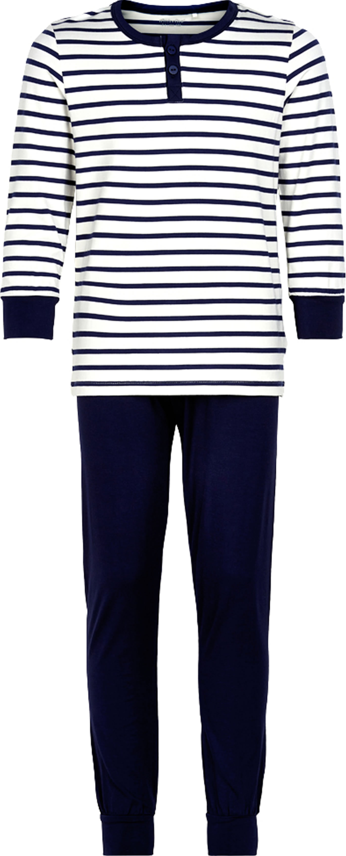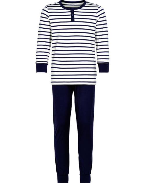 Schöner, zweiteiliger Schlafanzug im weiß-blauen Ringeldesign von MINYMO für Jungen. Das kühle und anschmiegsame Material aus Viskose fühlt sich angenehm auf der Haut an. Weiche Bündchen an Ärmel, Beinen und Taille sorgen für einen hohen Tragekomfort. Ein schönes Detail am Shirt sind der in blau abgesetzte Halsausschnitt und die Knopfleiste.
