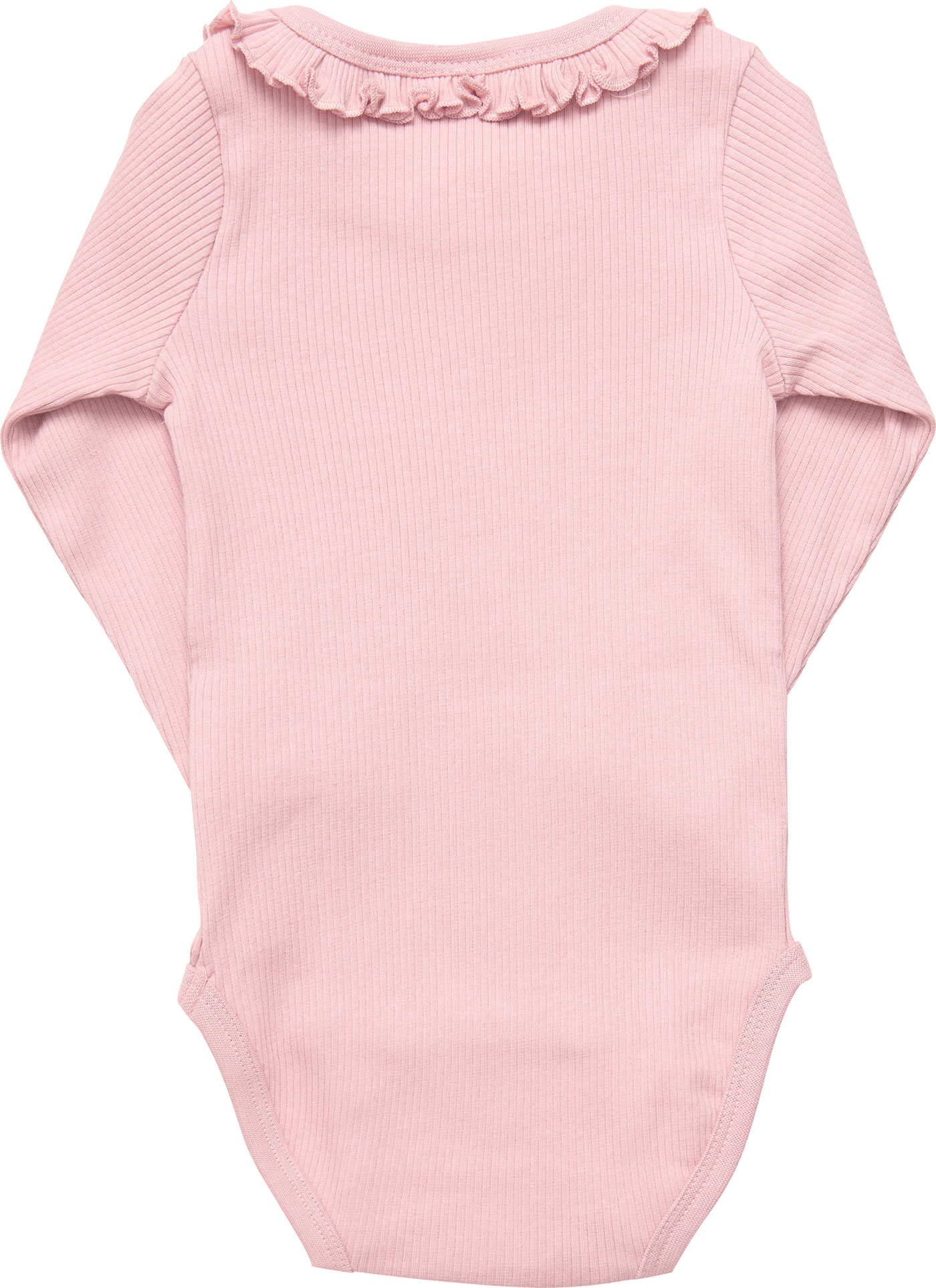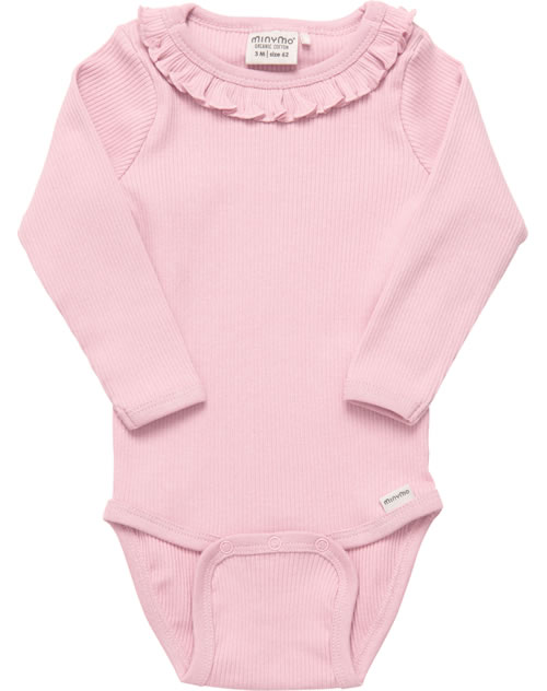 Anschmiegsamer Langarm-Body aus organischer Baumwolle von MINYMO. Druckknöpfe im Schritt und auf den Schultern erleichtern das An- und Ausziehen. Der Feinripp-Body ist aus weichem elastischen Material und macht jede Bewegung mit. Ein schönes Detail ist der gerüschte Kragen.