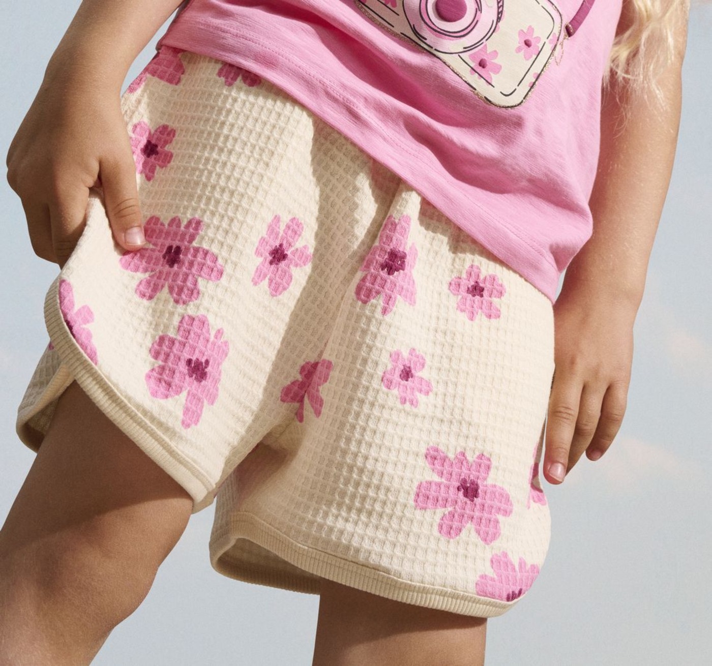 Der Allover-Print von hübschen Blüten auf der Waffelstruktur des Materials macht die Hose zu einem besonderen Blickfang.