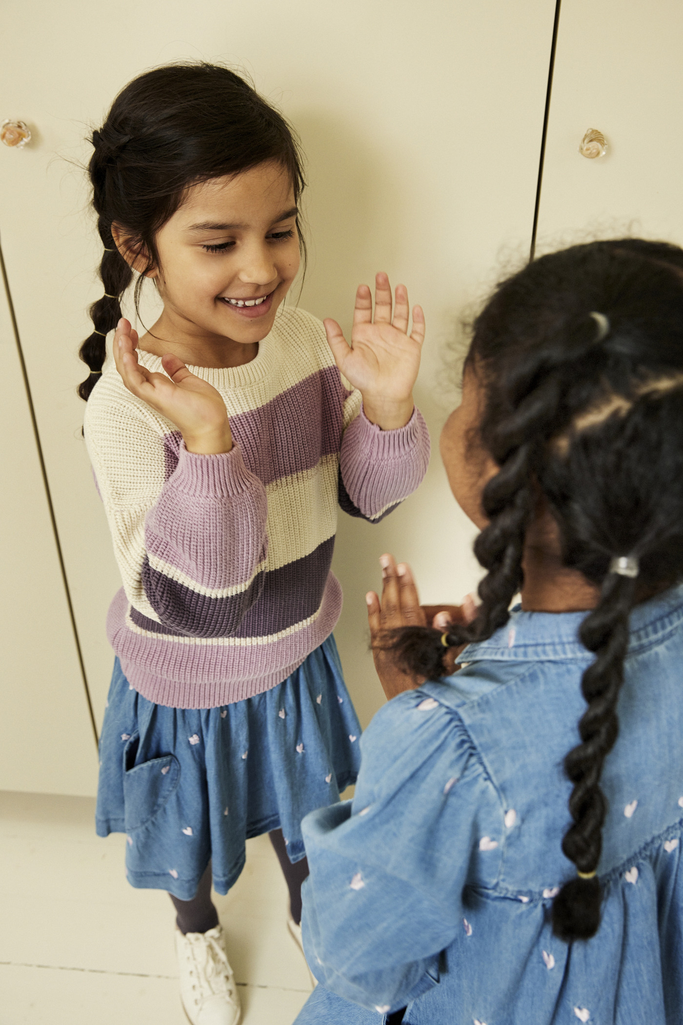 Wunderschöner gestreifter Strickpullover mit Glitzereffekt von Minymo. Der Strickpullover ist aus einer Baumwollmischung gefertigt und hat Rippkanten am Halsausschnitt, an den Handgelenken und am Saum.