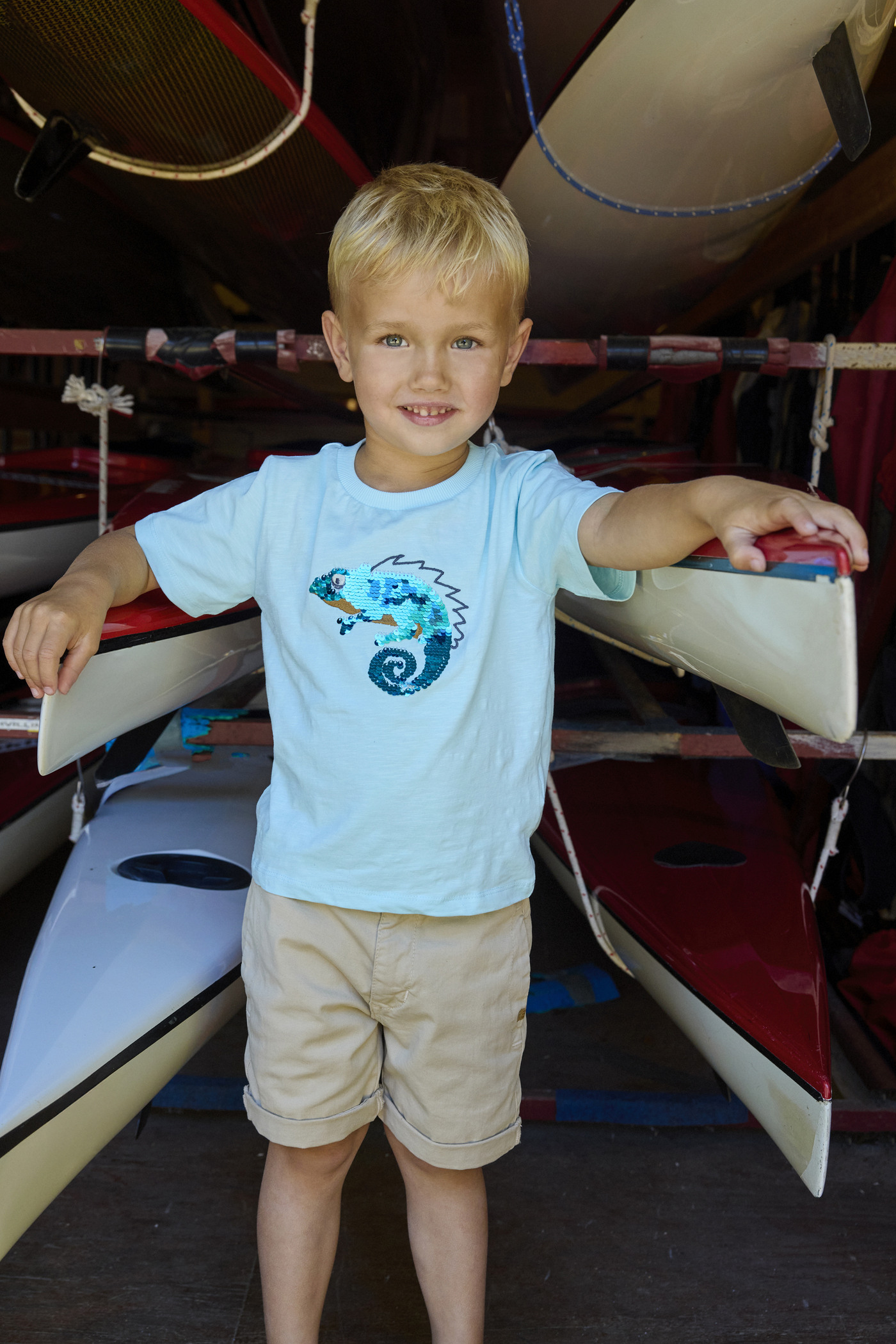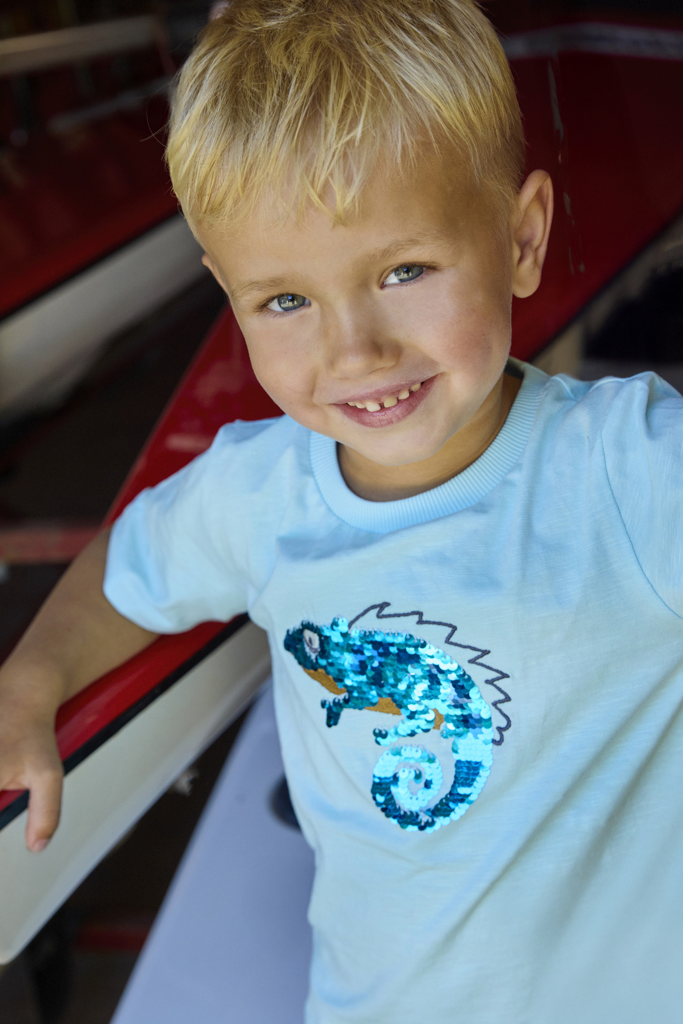 Es hat einen gerippten Rundhalsausschnitt und begeistert tierliebe Weltentdecker mit dem auffälligen Camelion auf der Vorderseite, der durch Pailletten und Bestickungen designt wurde. 😍