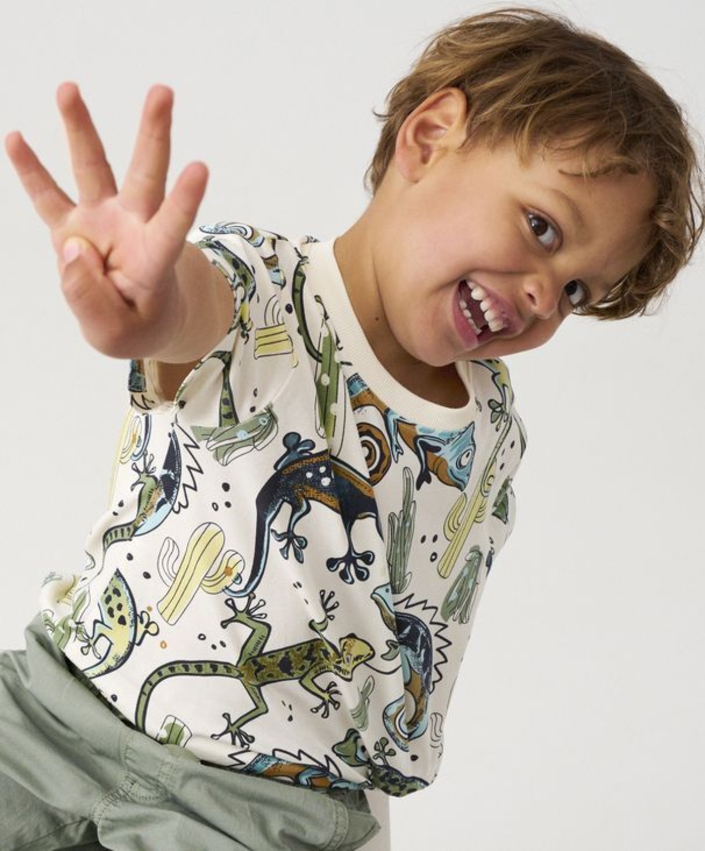 Es hat einen gerippten Rundhalsausschnitt und begeistert tierliebe Weltentdecker mit den bunten Gekkos, Eidechsen, Camelions und Kakteen rundum. 😍