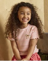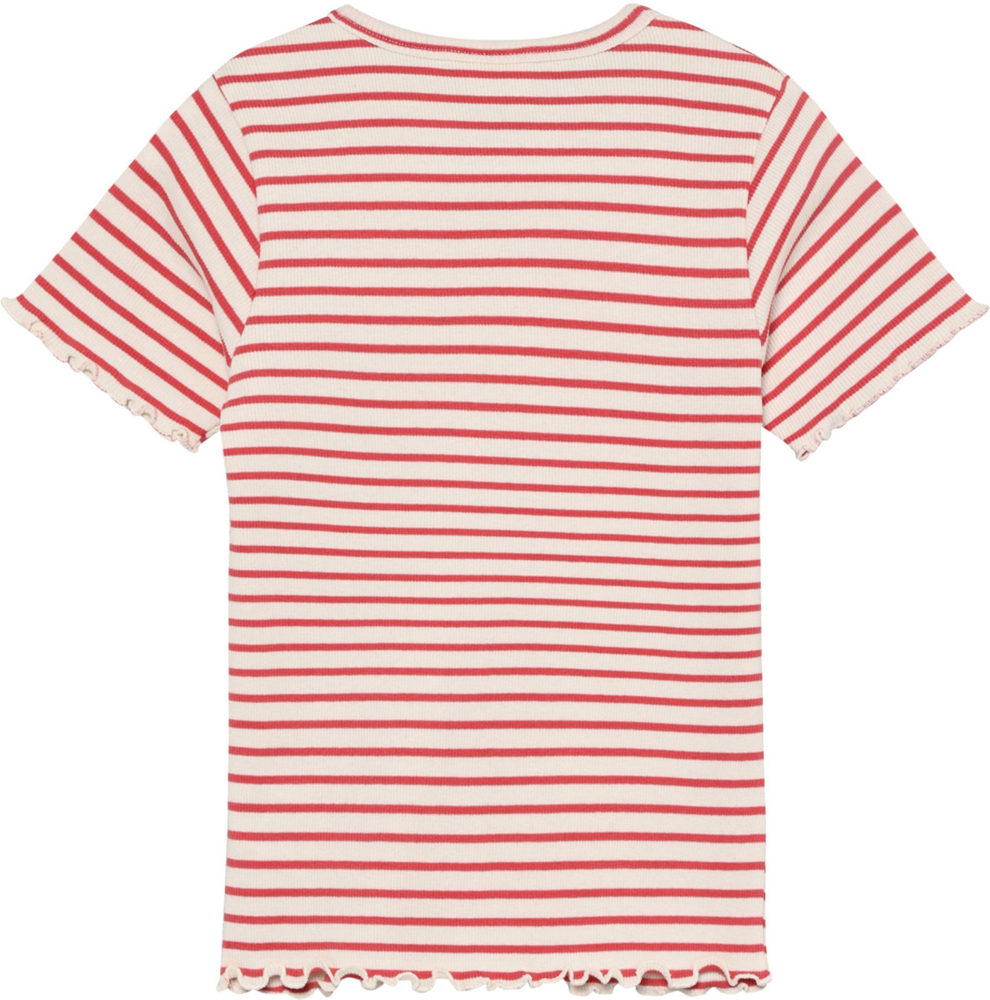 Besonders süß sind die gewellten Abschlüsse an Ärmeln und Saum, die dem Shirt eine verspielte Note verleihen.