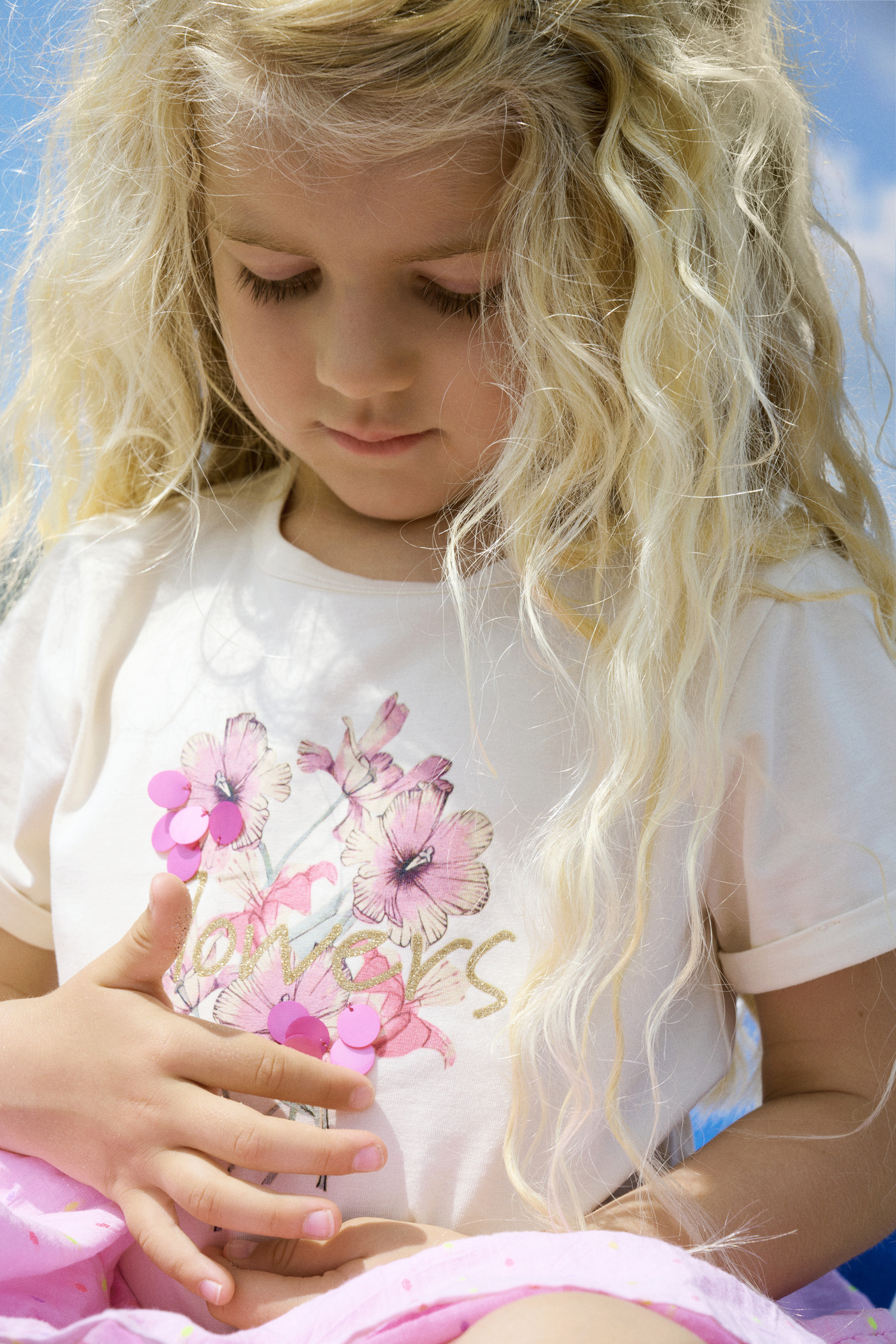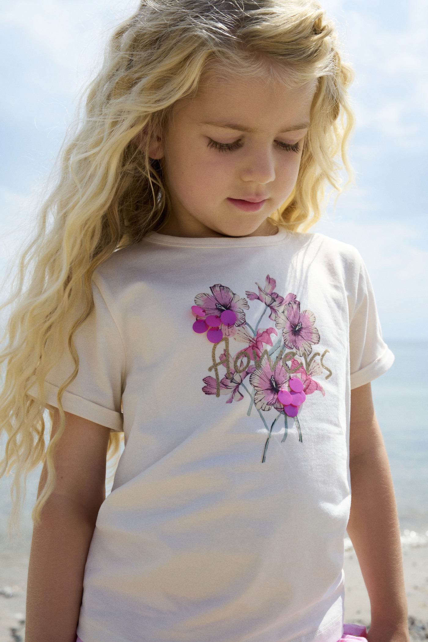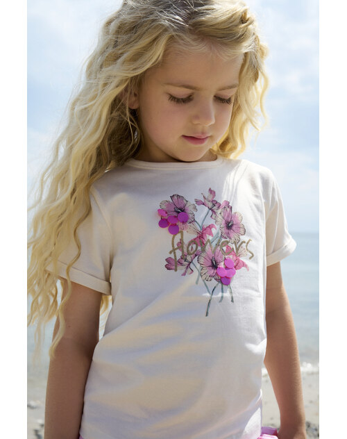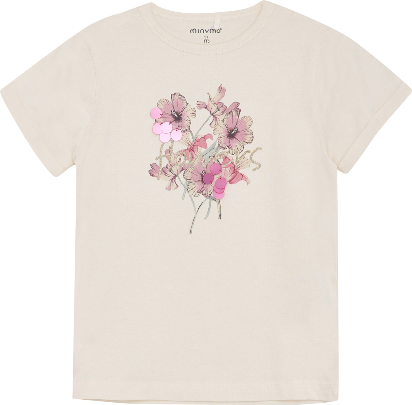 Dieses schöne T-Shirt von MINYMO hat einen hübschen Blumendruck mit Pailetten-Details auf der Vorderseite, der einfach Lust auf Sommer macht.
