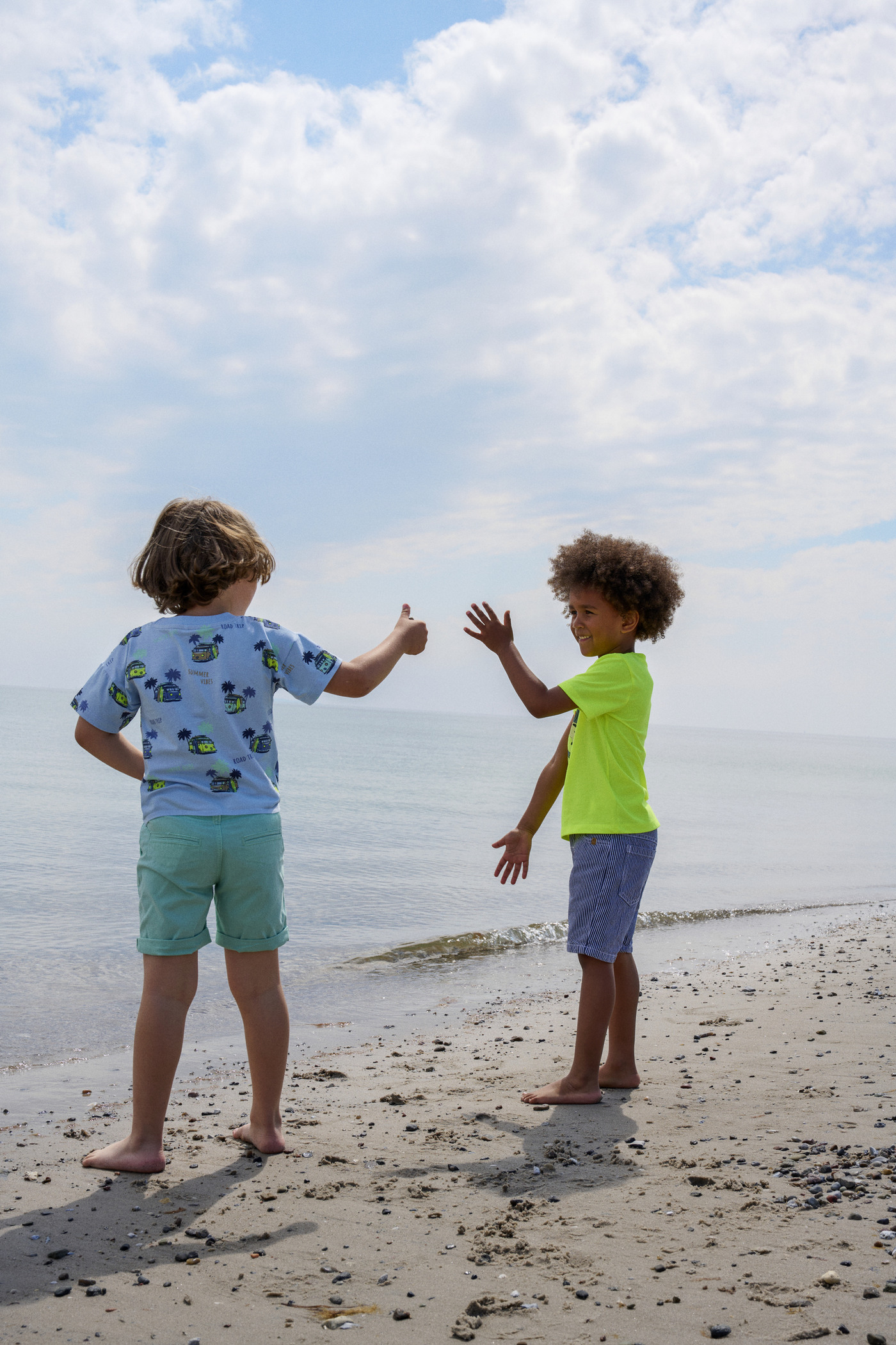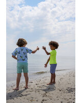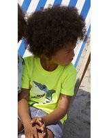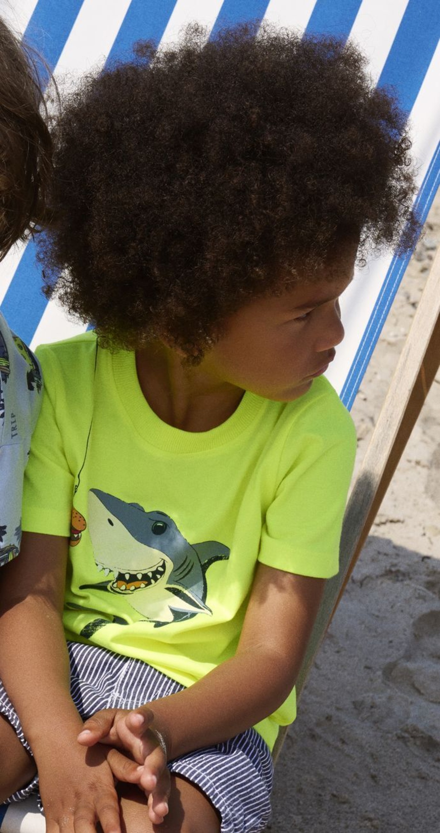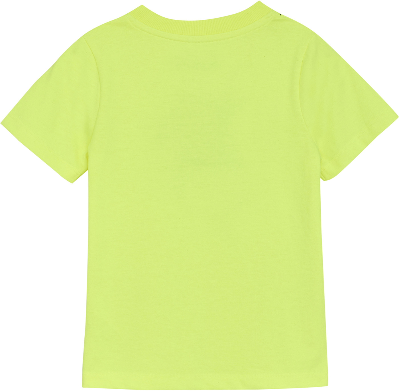 Dieses T-Shirt von Minymo hat einen coolen Hai-Print auf der Vorderseite und lässt den Shirt-Träger mit seiner gelben Neon-Farbe froh leuchten.