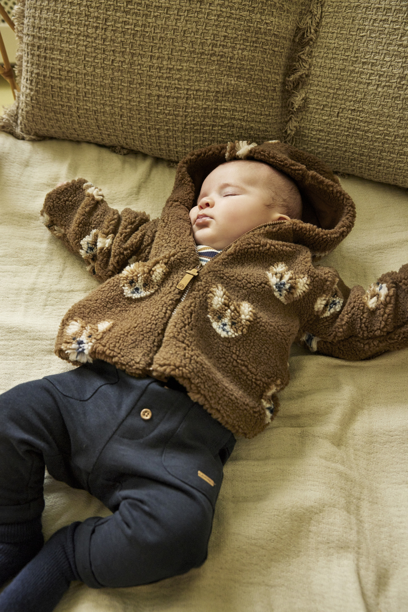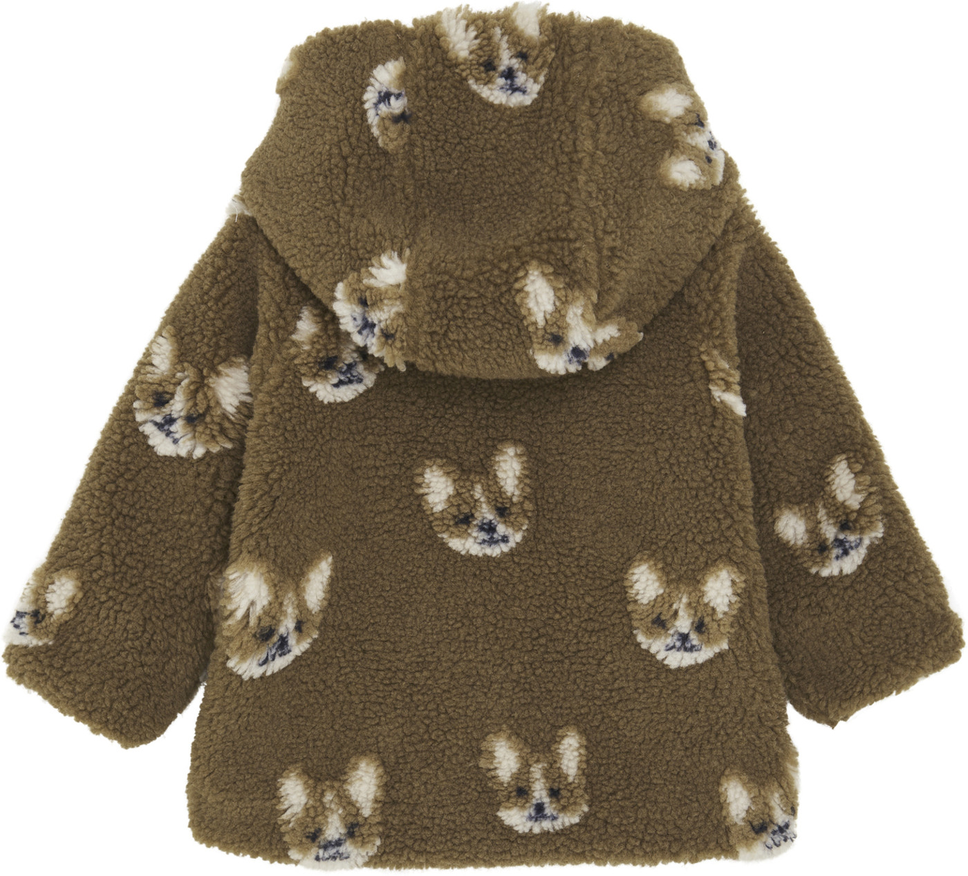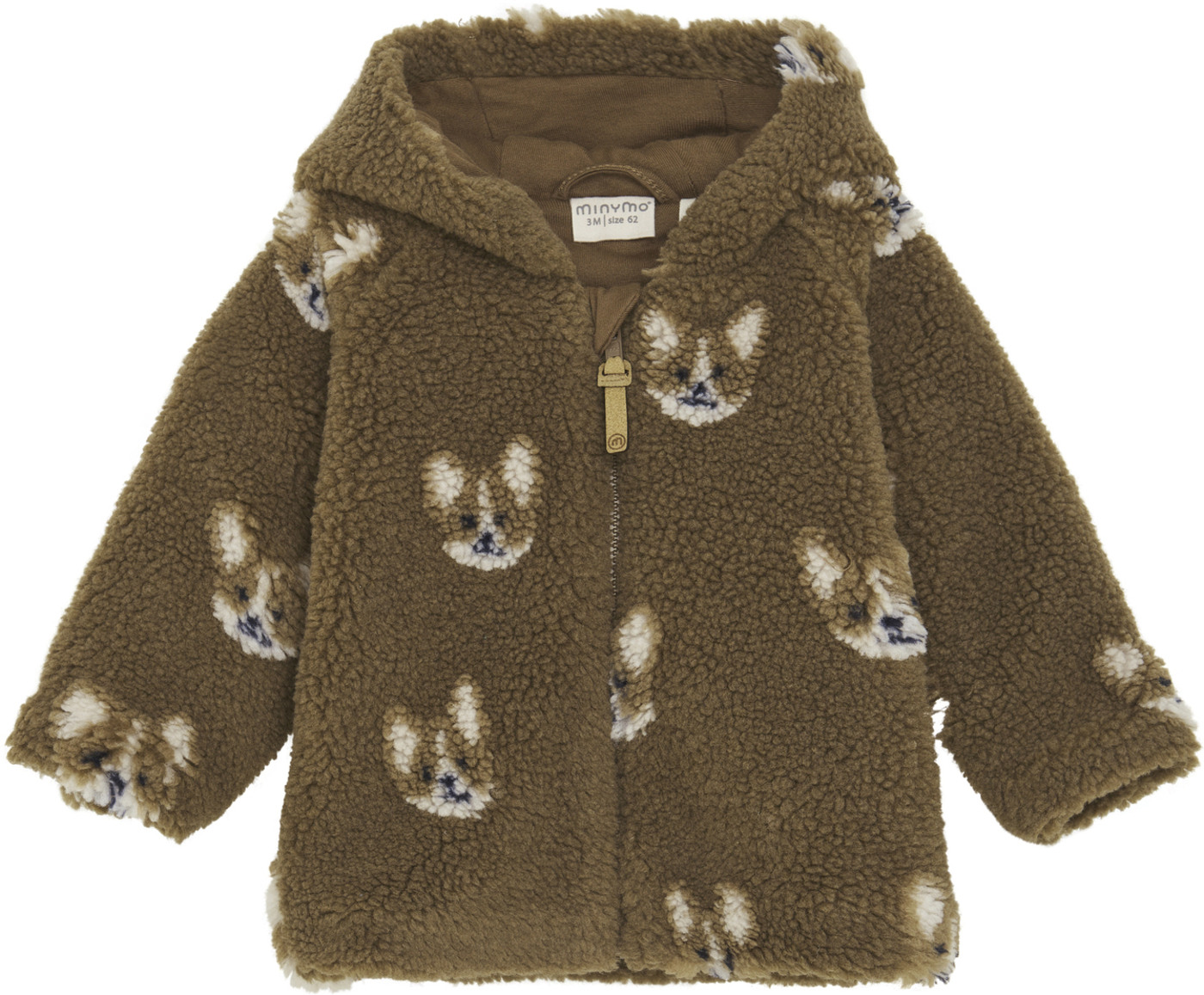 Süße Teddyjacke mit Aufdruck von Minymo. Der Anzug hat einen schönen Teddy-Look. Sie hat eine Kapuze und wird mit einem Reißverschluss mit Kinnschutz geschlossen.