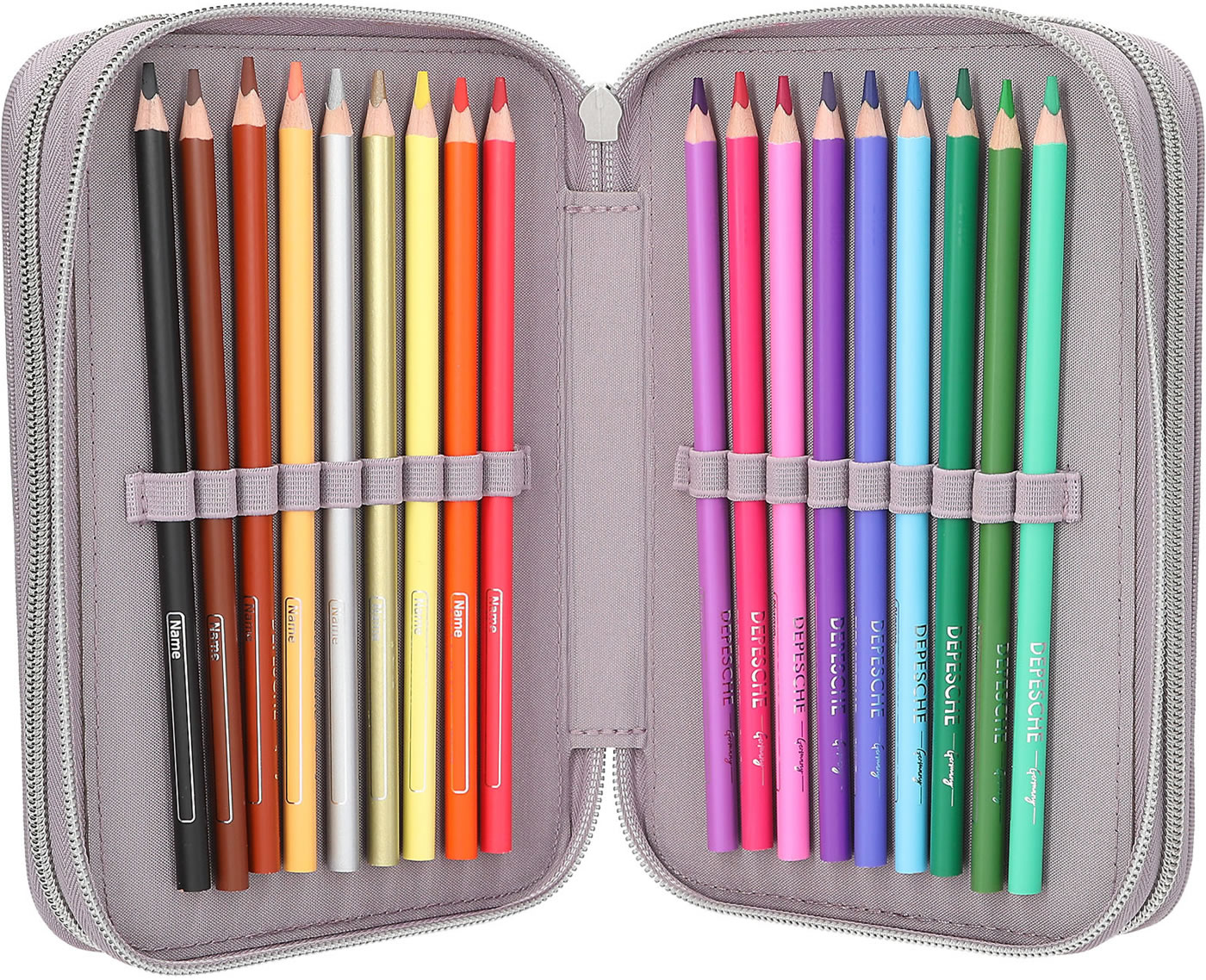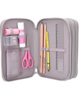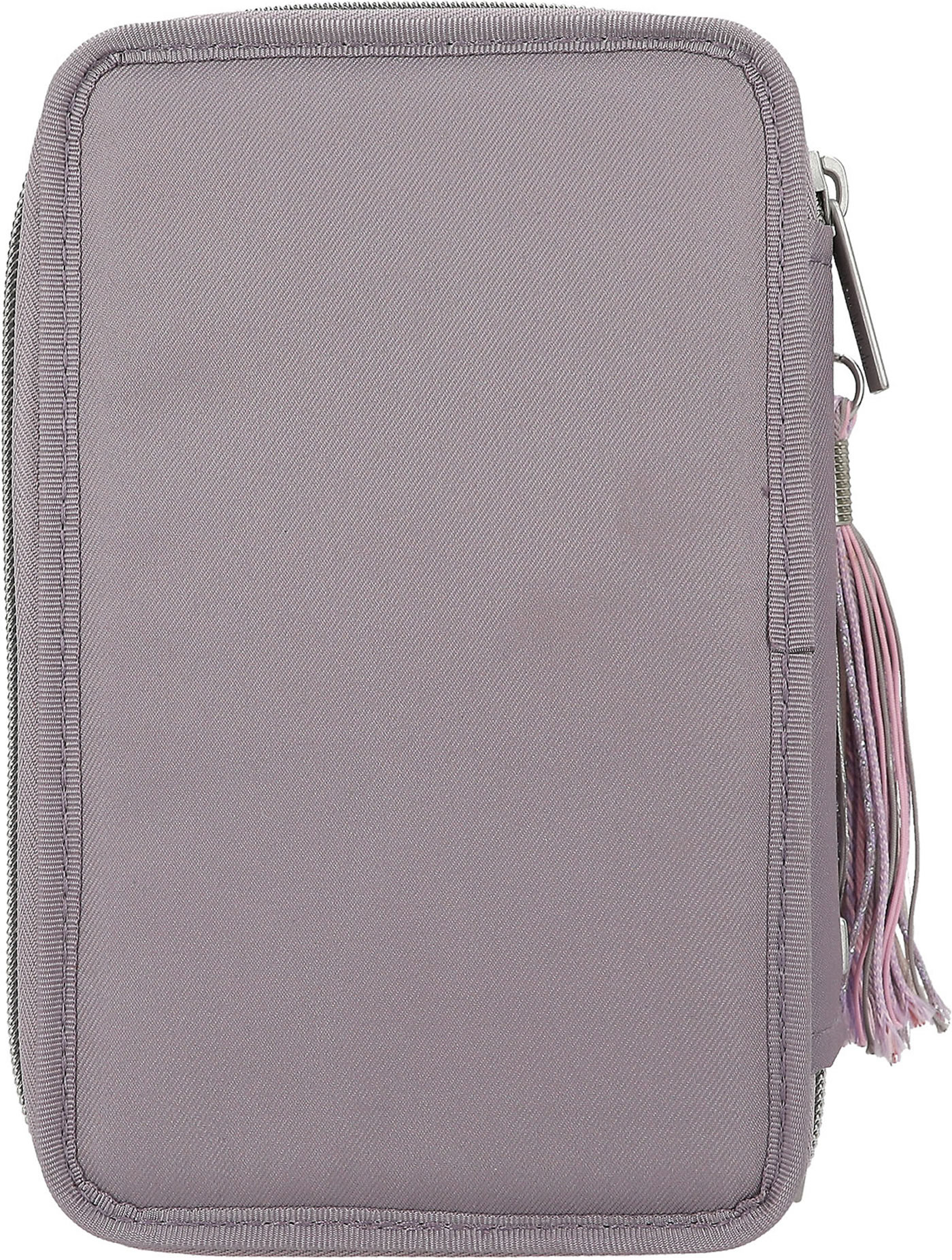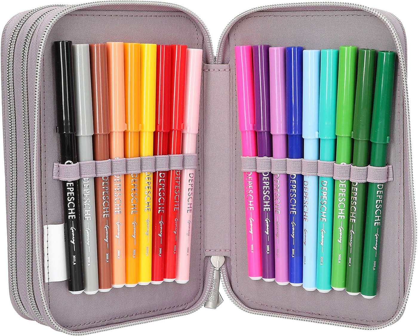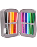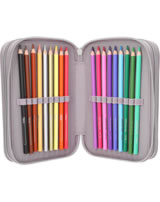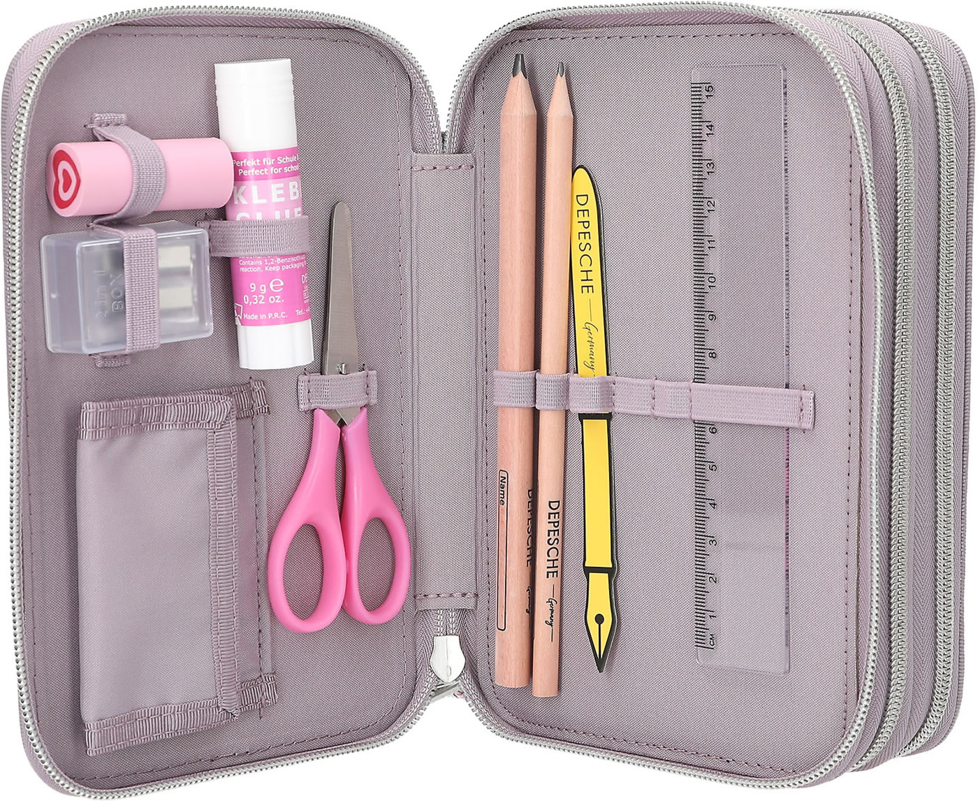So sanft, so schön: Die Federtasche von Miss Melody in blassem Lila hat auf der Front ein großes Pferde-Motiv mit Blumenkranz in der Mähne und silbernen Glitzer-Details. Echtes Highlight: der große Reißverschlussanhänger aus farblich harmonierenden, teilweise geflochtenen Fäden. Die drei separaten Fächer sind komplett gefüllt mit je 18 Bunt- und Filzstiften, 2 Bleistiften, Anspitzer, Radierer, Lineal, Schere, Klebestift und einem kleinen Klett-Täschchen.