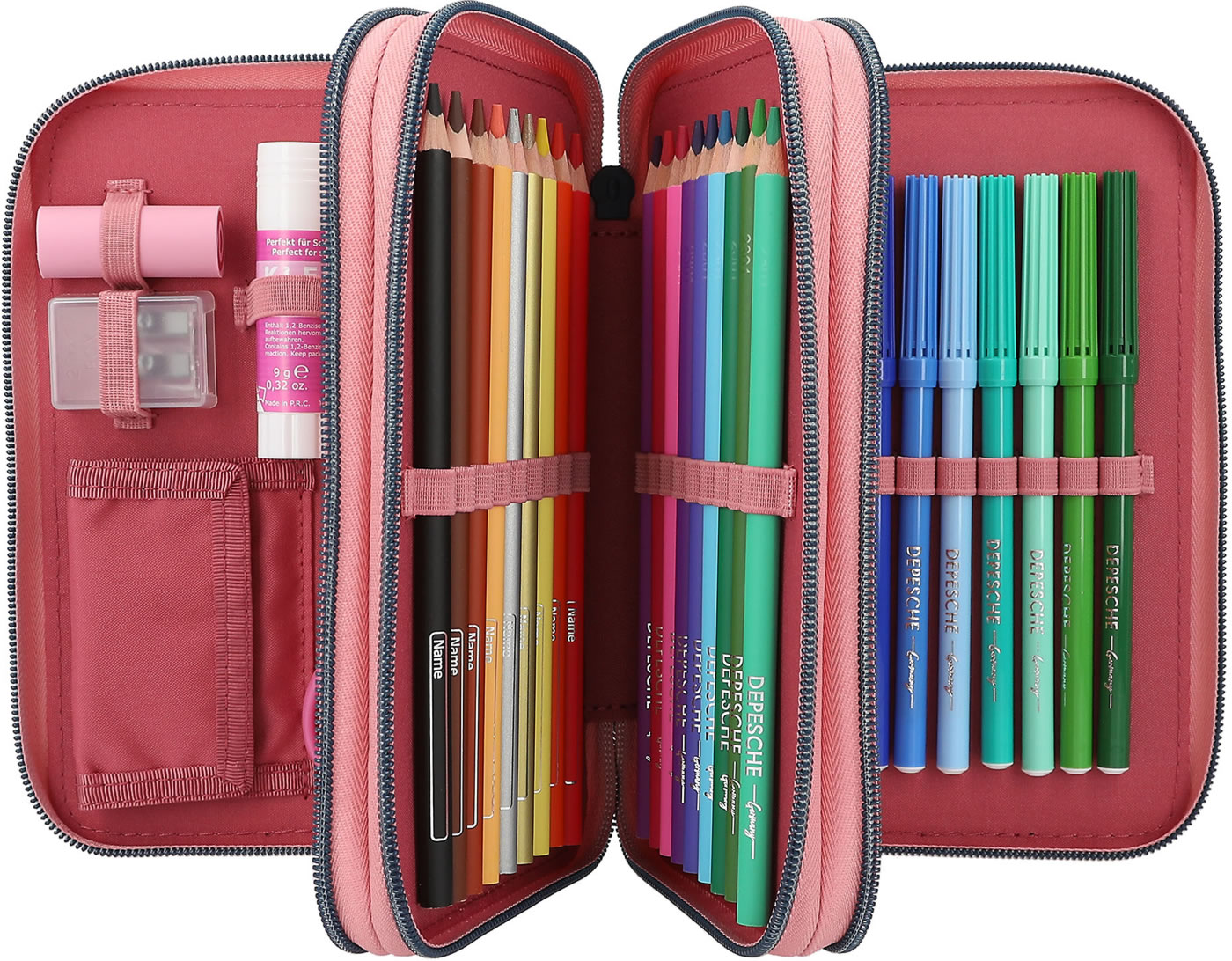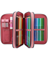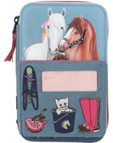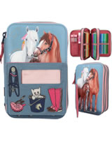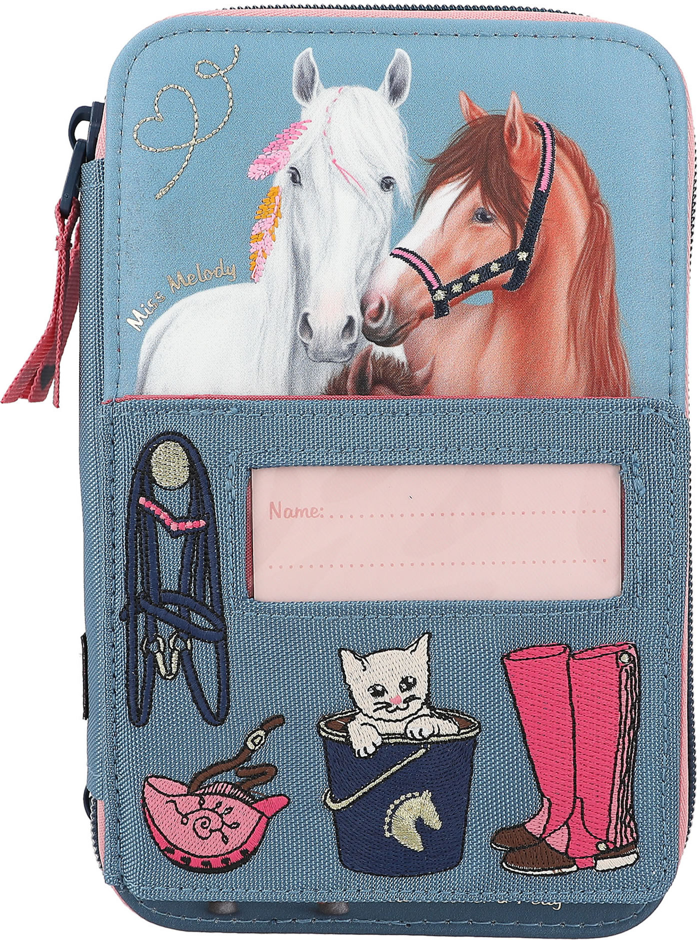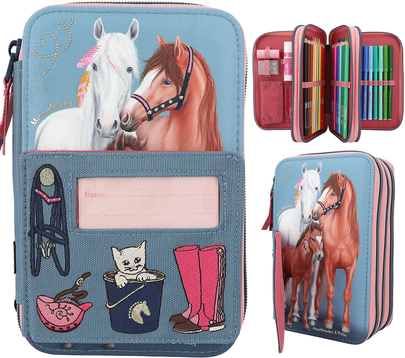 Den Stall in der Schule dabei: Die blaue 3-Fach-Federtasche von Miss Melody hat ein wunderschönes Motiv mit drei Pferden auf der Front, das halb von einer Lasche verdeckt wird, die man wie eine Stalltür auf- und zuklappen kann. Mit aufwendigen Stickerei-Verzierungen und einem Namenskartenfach. Die drei separaten Fächer der Federtasche sind komplett gefüllt mit je 18 Bunt- und Filzstiften, 2 Bleistiften, Anspitzer, Radierer, Lineal, Schere, Klebestift und einem kleinen Klett-Täschchen.