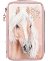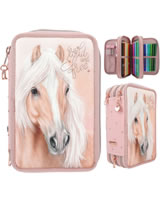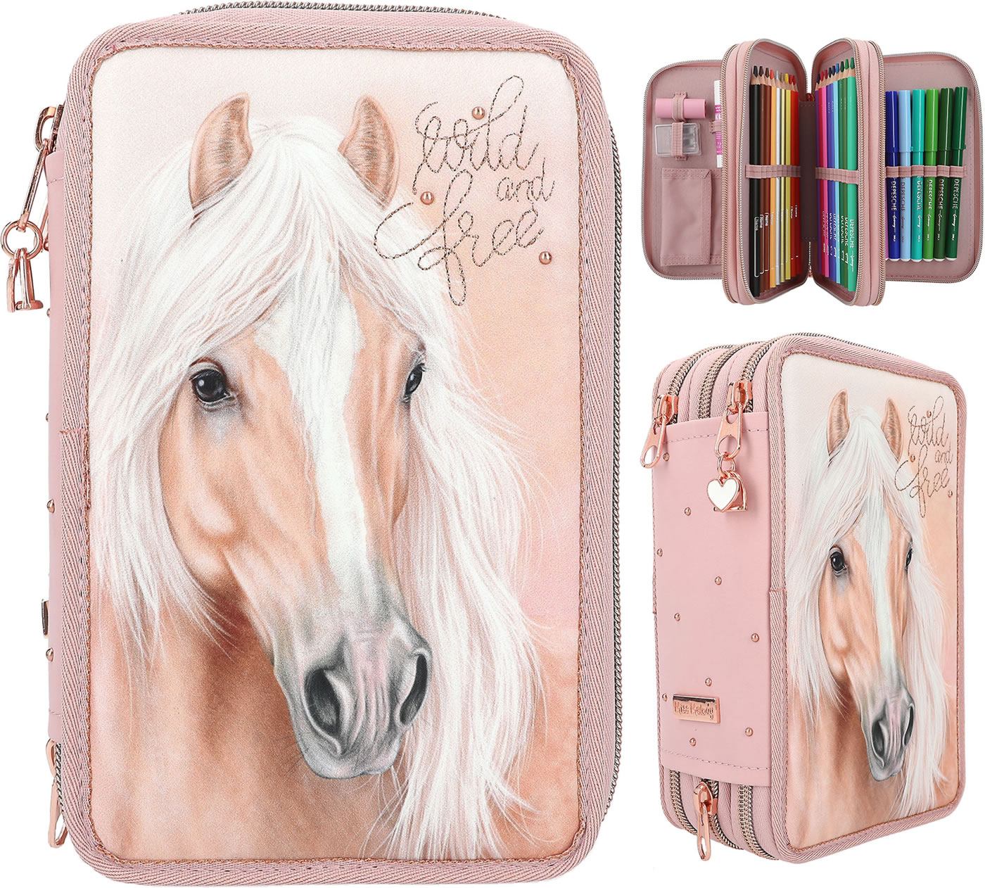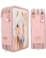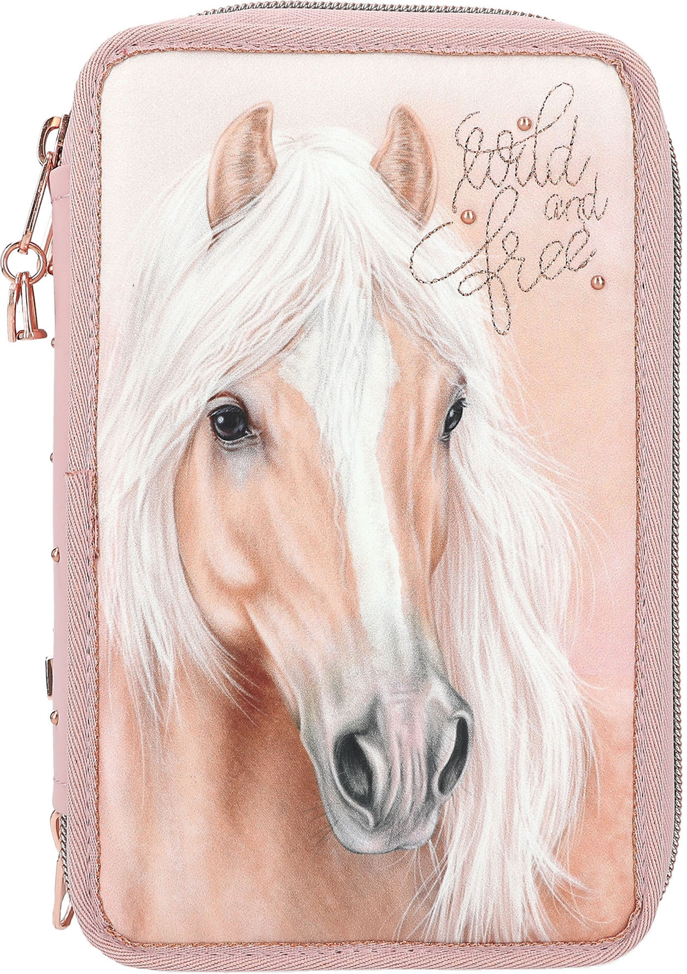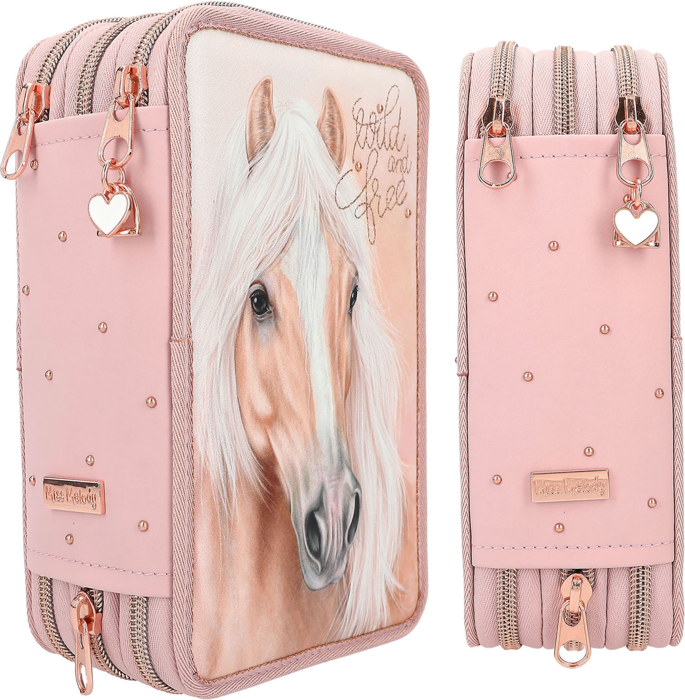 Ein romantischer Pferde-Traum: Die rosafarbene Federtasche von Miss Melody hat auf der Front ein traumhaftes Pferdemotiv in sanften Braun-Rosa-Tönen mit schimmernder Lurex-Stickerei. Auf der Seite und Rückseite ist die Federtasche mit kleinen Metallsteinchen verziert. So süß: der kleine Steigbügel und das Herzchen als Anhänger am Reißverschluss. Die drei separaten Fächer sind komplett gefüllt mit je 18 Bunt- und Filzstiften, 2 Bleistiften, Anspitzer, Radierer, Lineal, Schere, Klebestift und einem kleinen Klett-Täschchen.