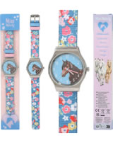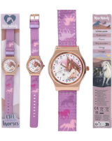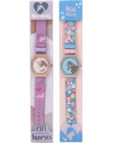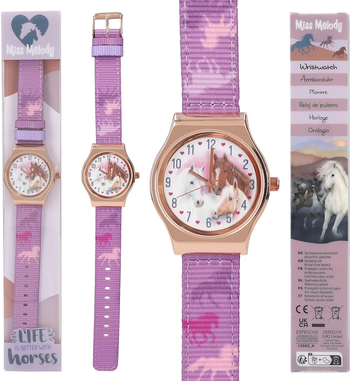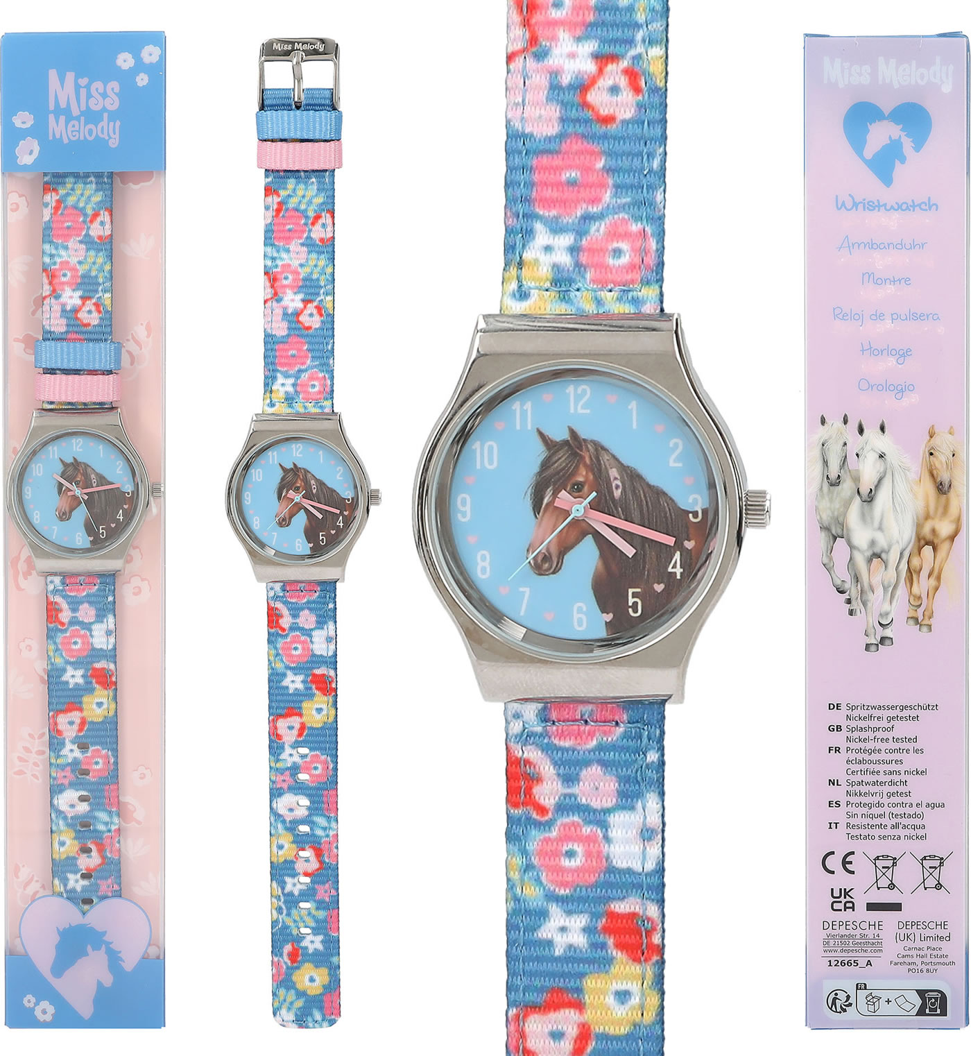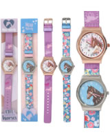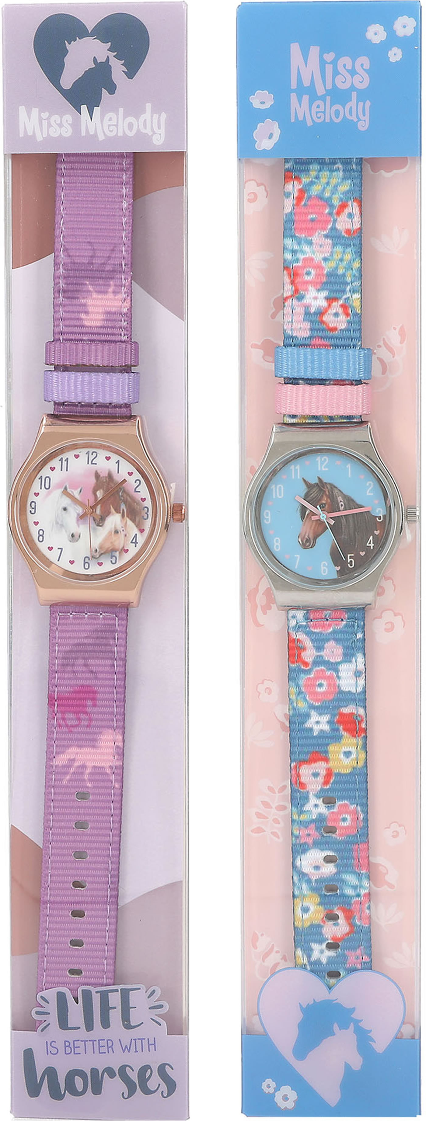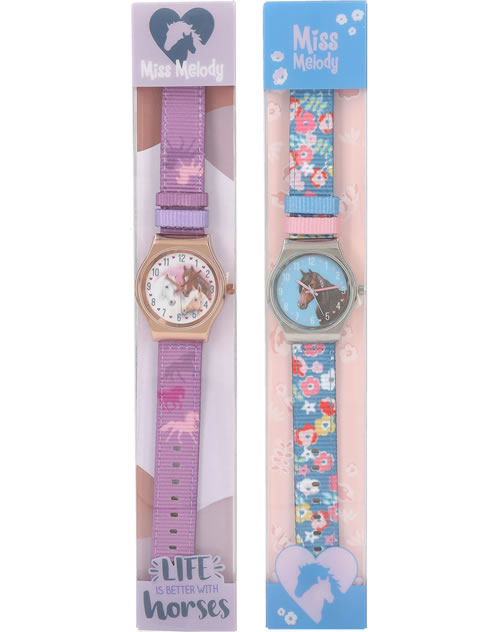 Viertel vor Pony! Die superschönen Armbanduhren von Miss Melody mit toll bedruckten Textil-Armbändern gibt es in zwei hübschen Pferde-Designs: mit silbernem Gehäuse, geblümtem Armband und blauem Ziffernblatt mit braunem Pferd und mit roségoldenem Gehäuse, zwei galoppierenden Pferden auf dem Ziffernblatt und einem lilafarbenen Armband mit farbigen Pferde-Silhouetten. Die Armbanduhren sind spritzwassergeschützt, nickelfrei getestet und sind mit einer Knopfzelle (SR626SW) ausgestattet.
