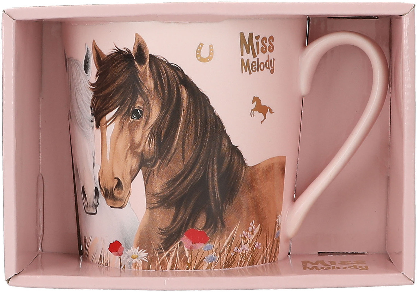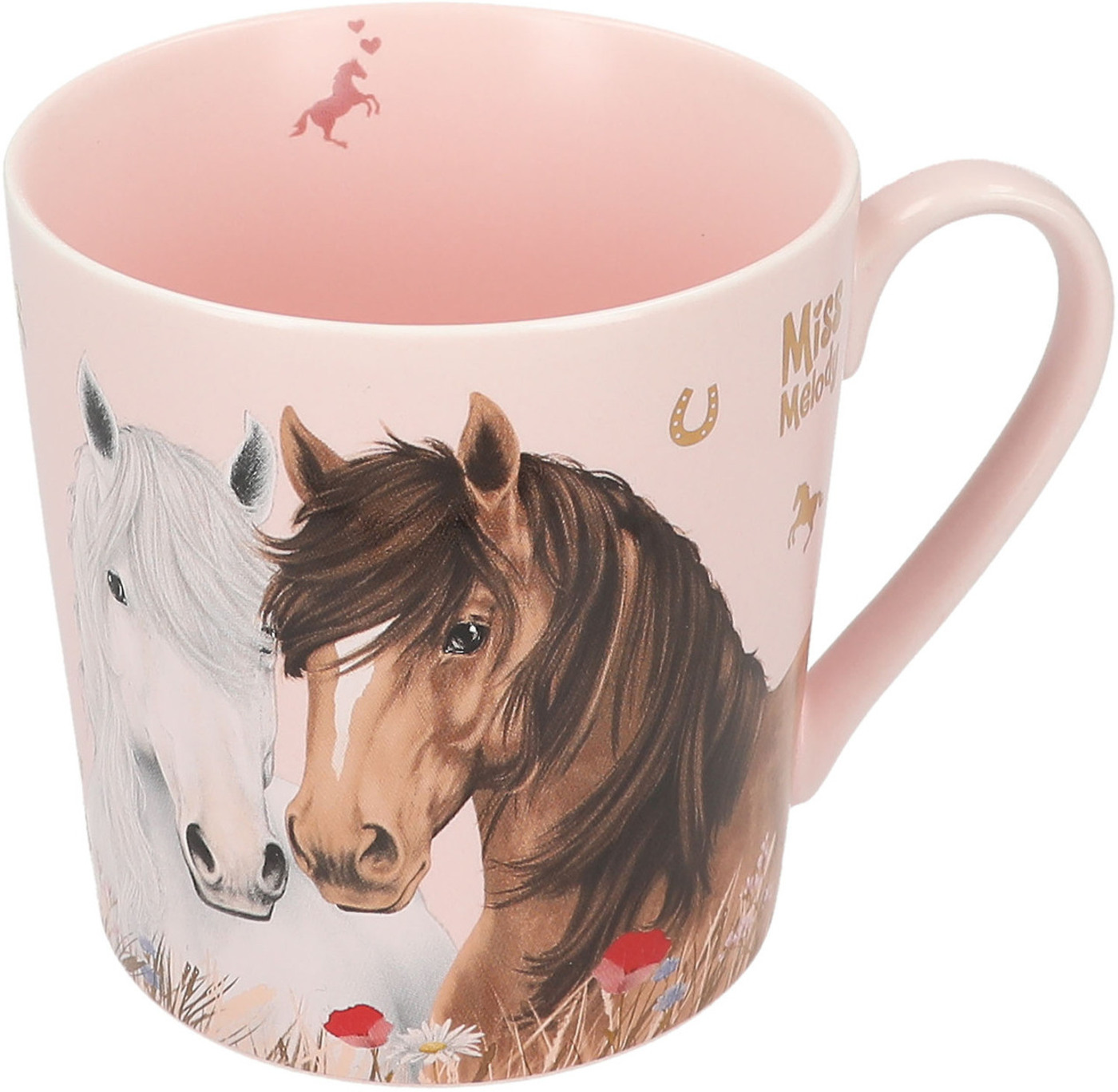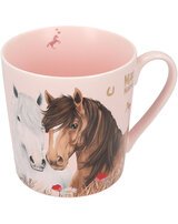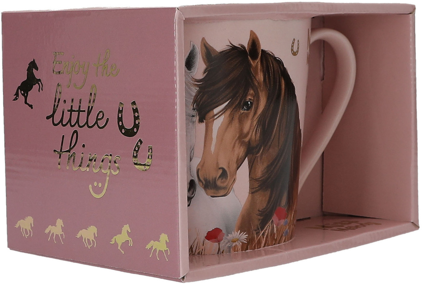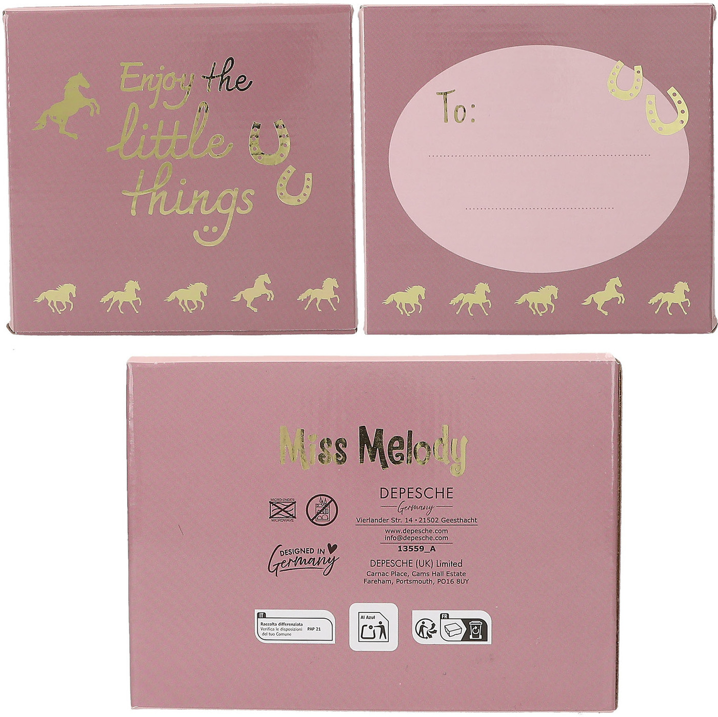 Der Lieblingsbecher fürs Lieblingsgetränk: Der rosafarbene Porzellanbecher DUSTY ROSE von Miss Melody hat einen hübschen Aufdruck mit einem braunen und einem weißen Pferd, bunten Feldblumen, kleinen Pferden und Hufeisen sowie einem süß gestalteten Statement. Mit glänzender Gold-Veredelung und verpackt in einem hochwertigen Geschenk-Karton. Aufgrund des aufwendigen Aufdrucks ist der Becher nicht geeignet für die Nutzung in der Mikrowelle und Spülmaschine. Fassungsvermögen: 300 ml. Material: New Bone China Porzellan