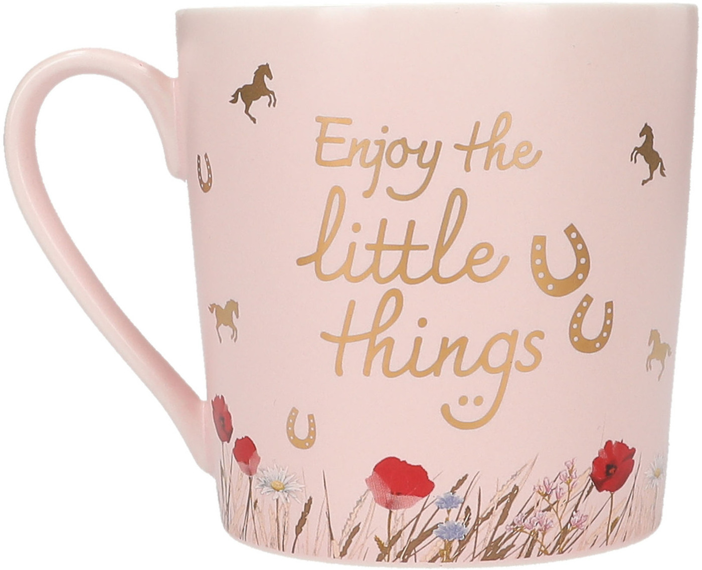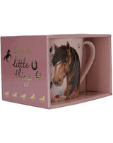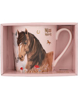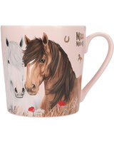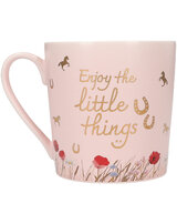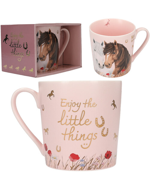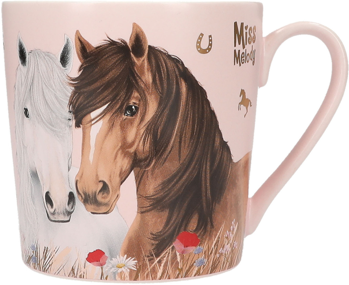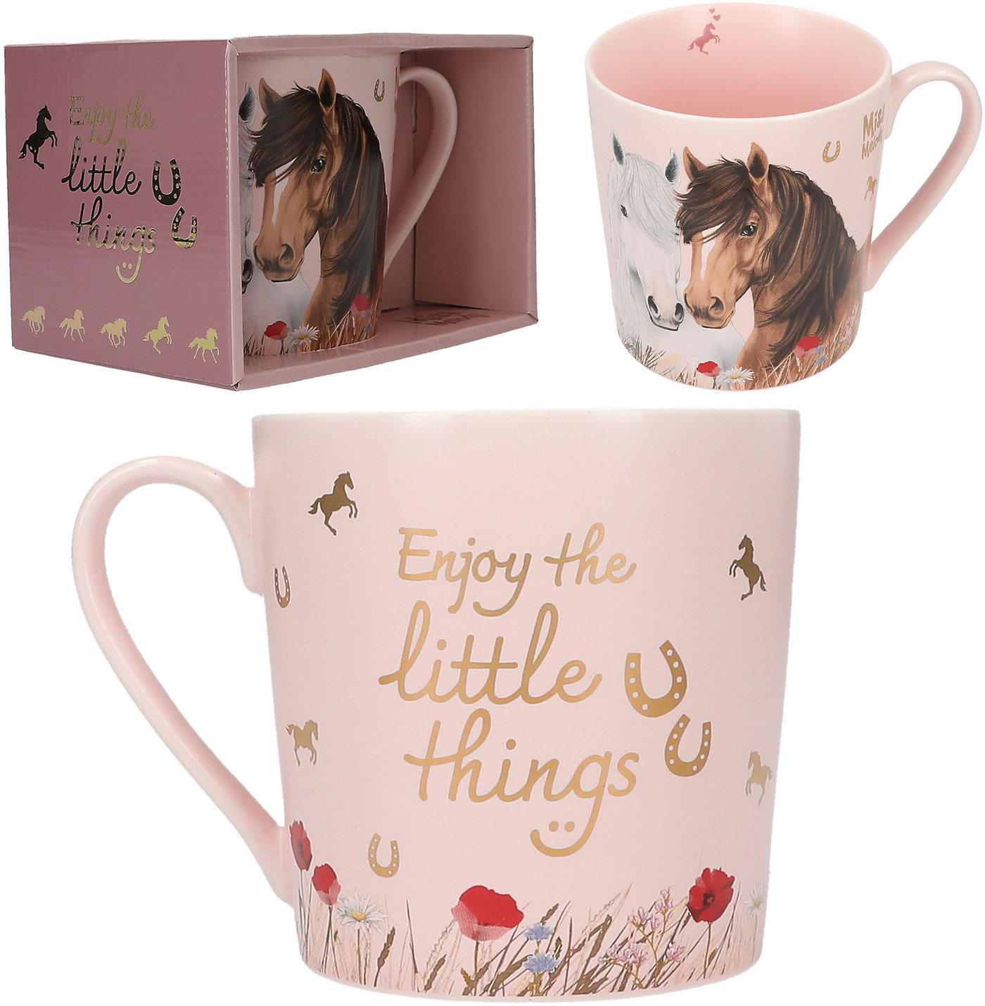 Der Lieblingsbecher fürs Lieblingsgetränk: Der rosafarbene Porzellanbecher DUSTY ROSE von Miss Melody hat einen hübschen Aufdruck mit einem braunen und einem weißen Pferd, bunten Feldblumen, kleinen Pferden und Hufeisen sowie einem süß gestalteten Statement. Mit glänzender Gold-Veredelung und verpackt in einem hochwertigen Geschenk-Karton. Aufgrund des aufwendigen Aufdrucks ist der Becher nicht geeignet für die Nutzung in der Mikrowelle und Spülmaschine. Fassungsvermögen: 300 ml. Material: New Bone China Porzellan