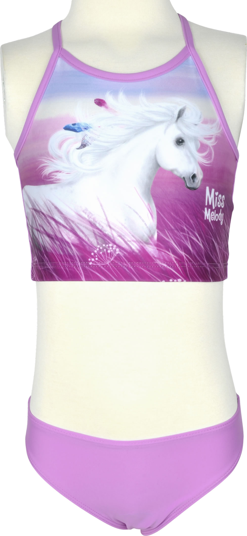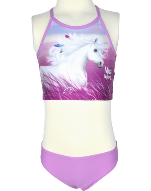 Trendiger Tankini in pink von MissMelody. Auf dem Oberteil ist ein weißes Pferd abgebildet. Die Träger sind auf dem Rücken gekreuzt.