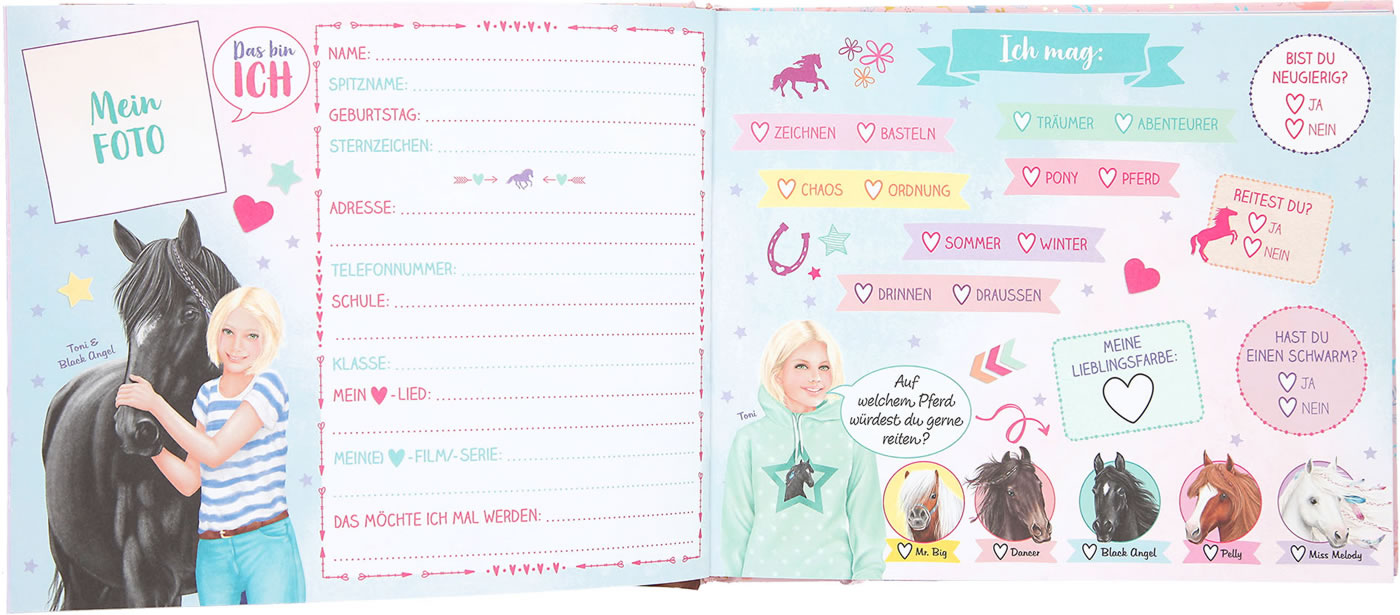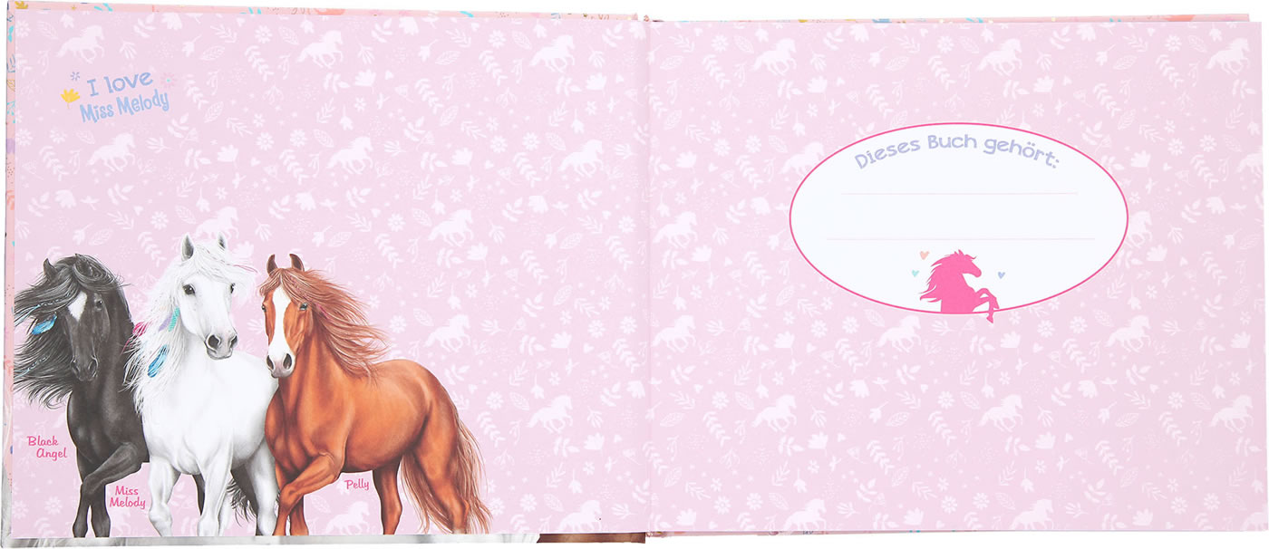 Diese Freundebuch bietet dir und deinen Freundinnen Platz für all eure Lieblingspferde, Hobbies, liebste Musik und was ihr noch so übereinander wissen wollt - und das alles im Miss Melody Design.