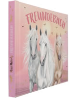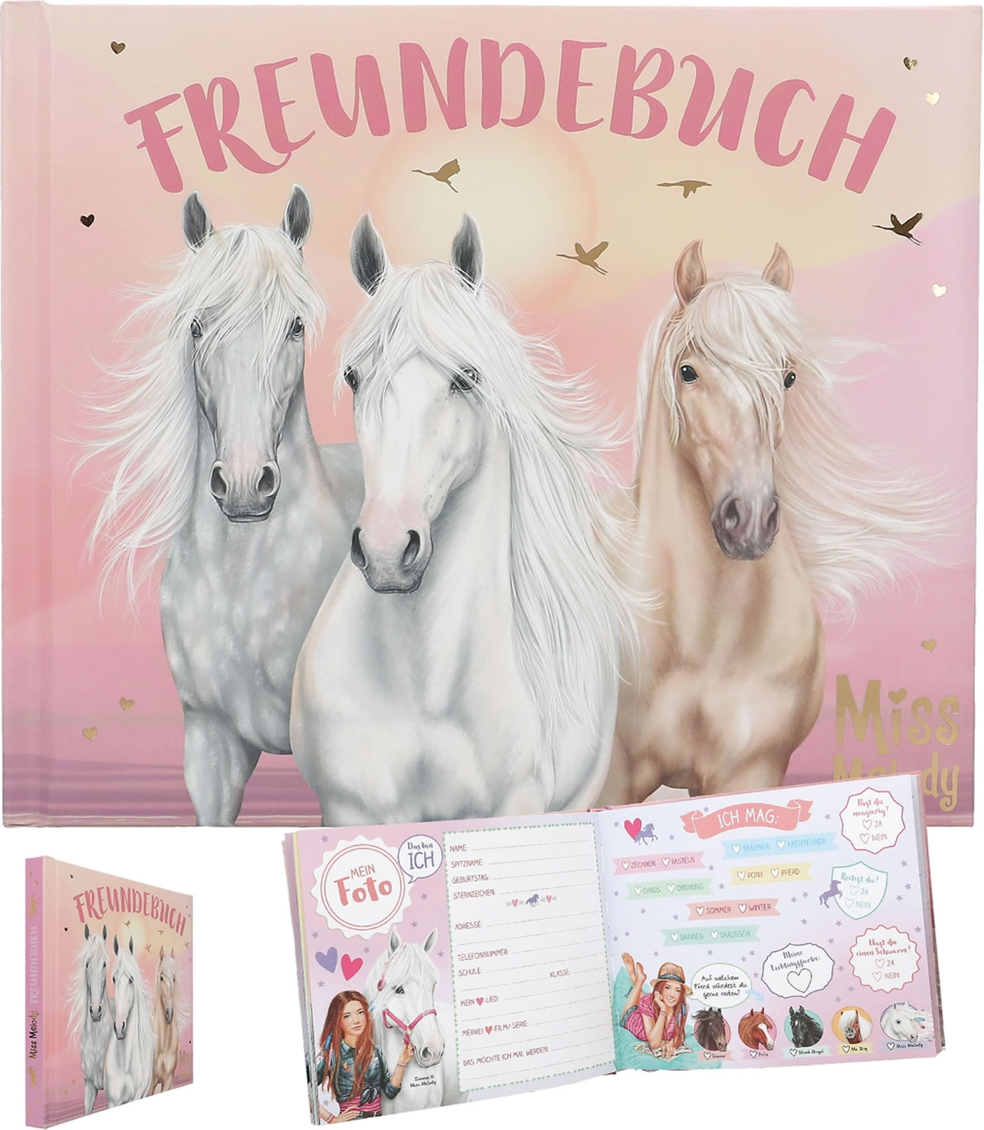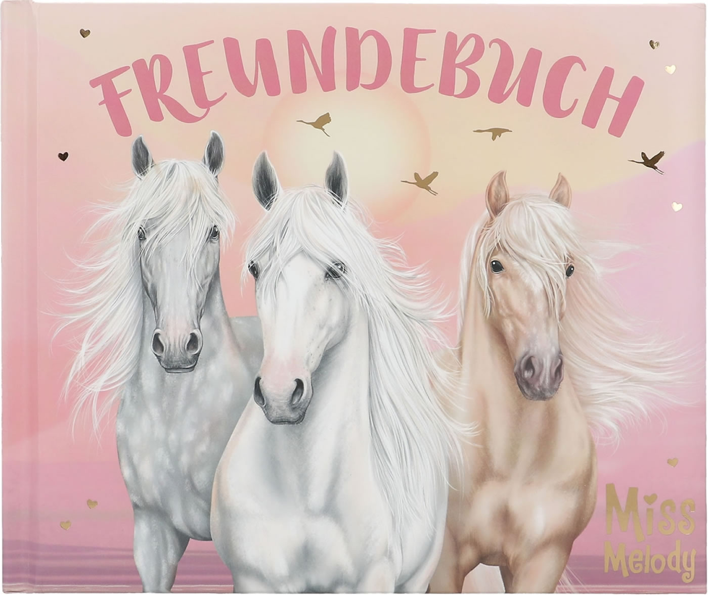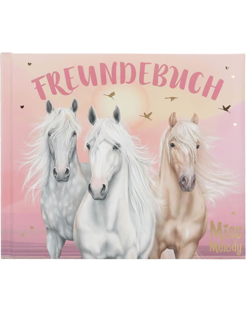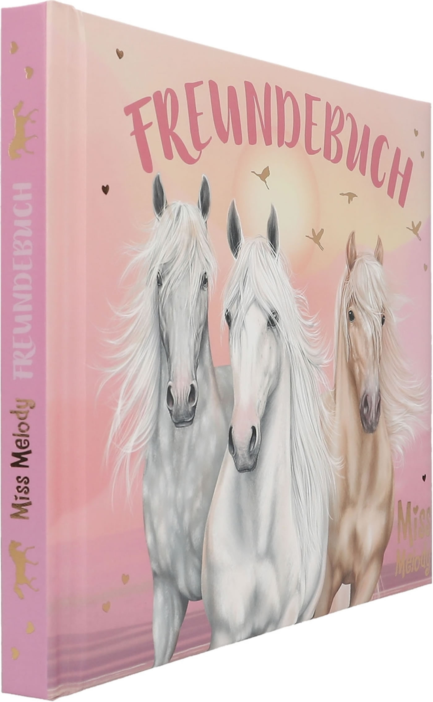 Das Freundebuch von Miss Melody in wunderschönen Rosétönen und mit traumhaften Pferden im Sonnenuntergang hat 108 liebevoll illustrierte Seiten für die Einträge der liebsten Menschen. Mit wattiertem Cover.