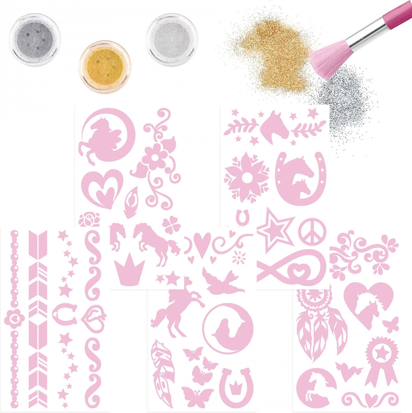 Inhalt: 38 Tattoos, 3 Glitzer-Puder, 1 Pinsel, 1 Anleitung