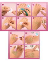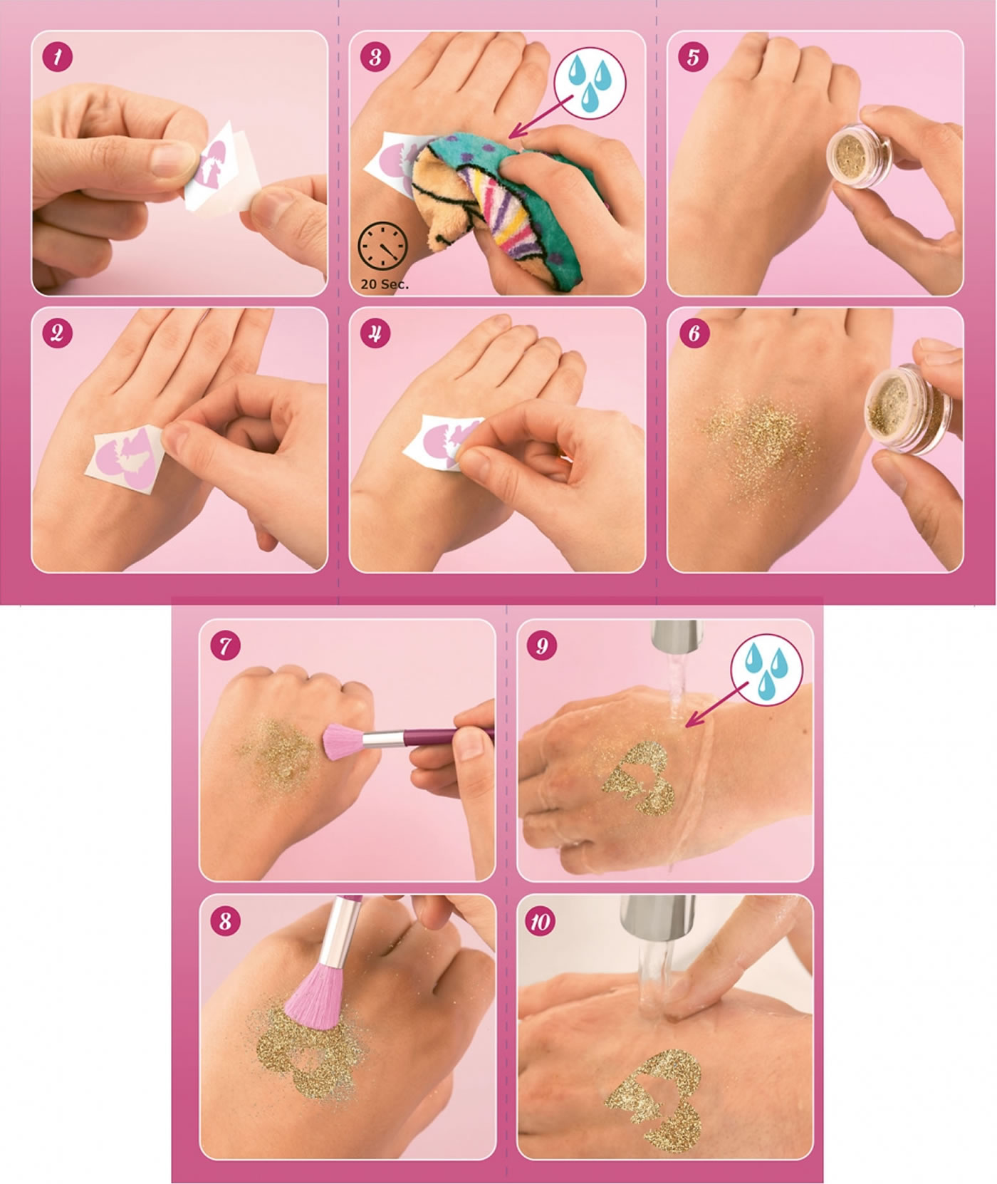 Wähle aus 38 Motiven und drei Glitzer-Pudern - und zaubere funkelnde Hingucker auf deine Haut.