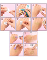 Für ponytastische Kunstwerke auf der Haut: Zum Glitzer Tattoo Set von Miss Melody gehören 41 Klebetattoos, 1 Pinsel, 3 Glitzer-Puder (Silber 1,8 g, Weiß 1,4 g, Gold 1,8 g) sowie eine anschauliche Anleitung. Empfohlen ab 4 Jahren.