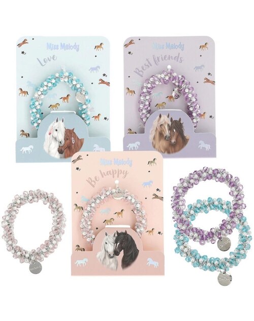 Glitzer-genial: Die Haargummis von Miss Melody sind mit farbig-transparenten Steinchen und weißen Perlen besetzt. 3 Designs: Türkis, Lila und zartes Rosa. Alle mit einem silbernen Handmade-Anhänger. Das eigentliche Gummiband ist goldfarben und nur im gezogenen Zustand sichtbar.