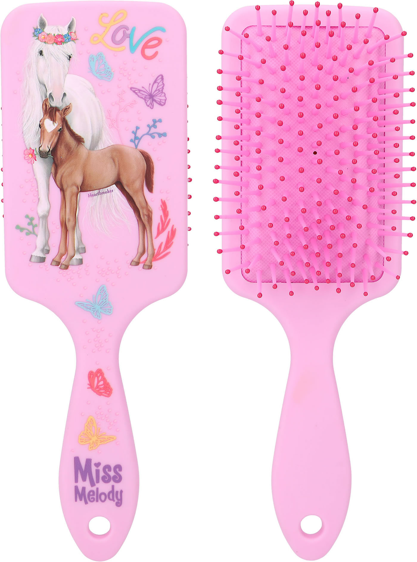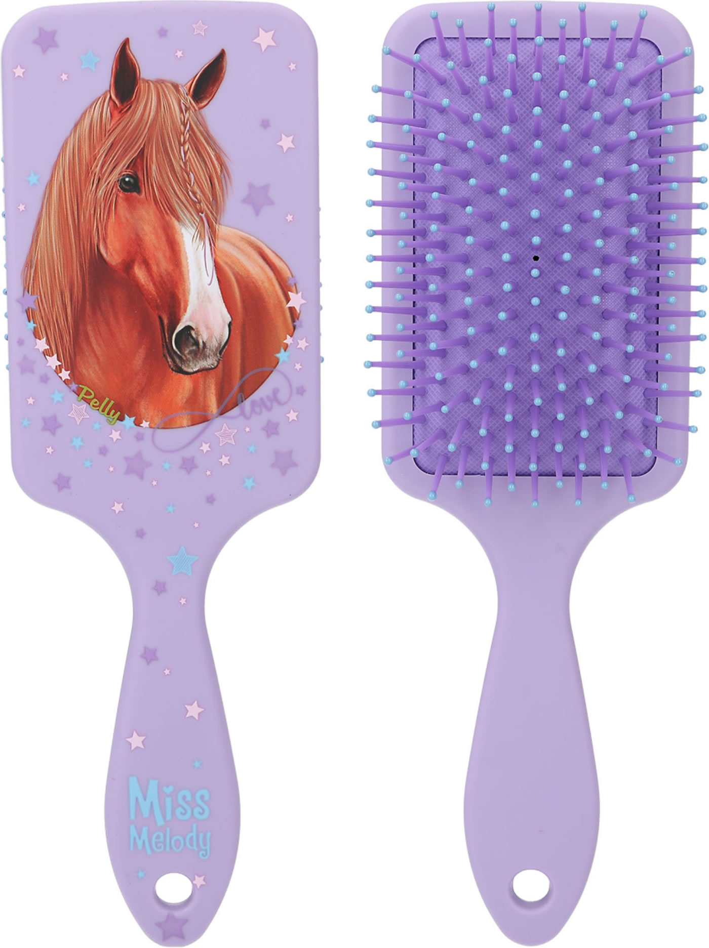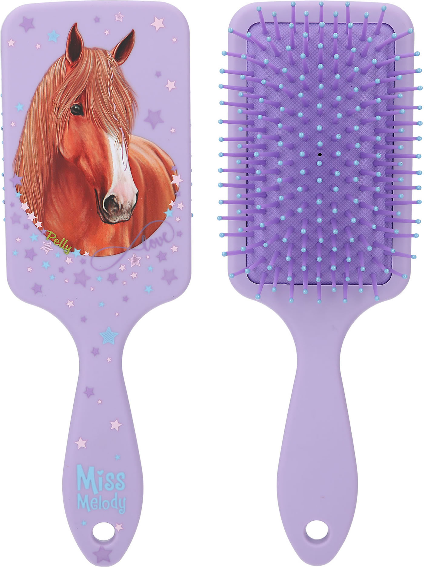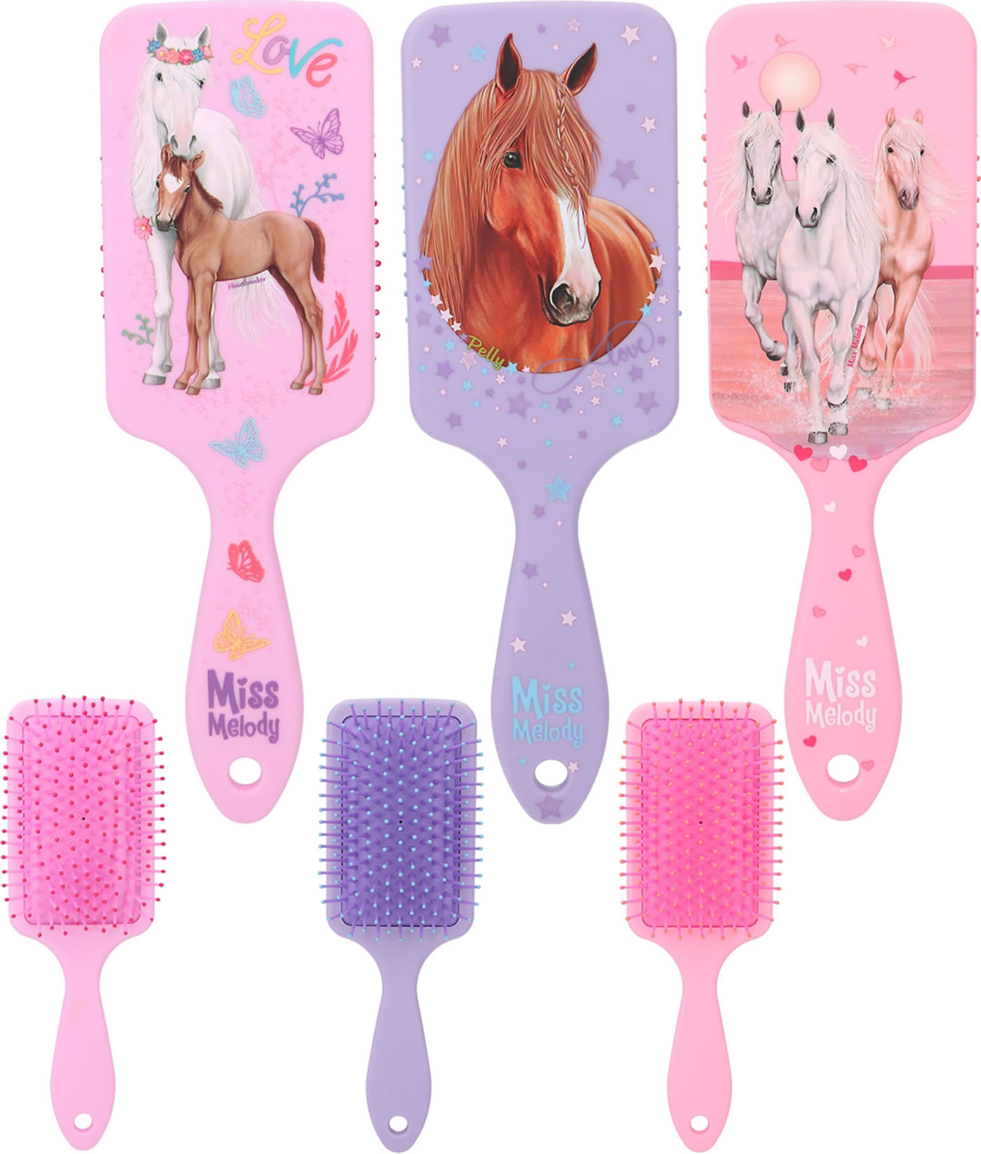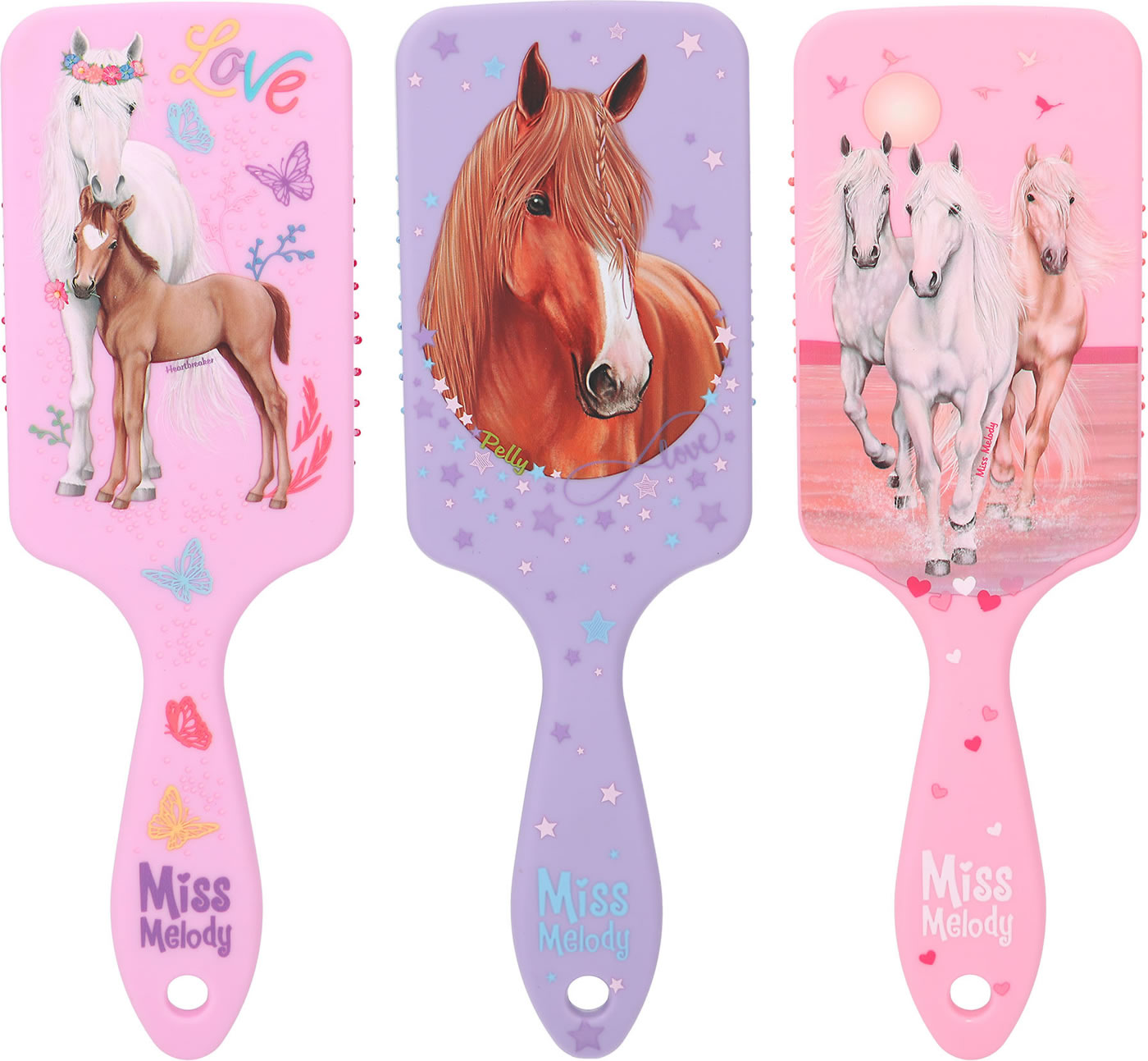 Die Haarbürsten von Miss Melody in klassischer Paddle-Form haben nicht nur angenehm weiche Borsten, sondern fühlen sich durch das softe Material-Finish in der Hand wunderbar zart an. In drei verschiedenen Farben (flieder, lila, rosa) und mit drei traumhaften Pferde-Motiven erhältlich.