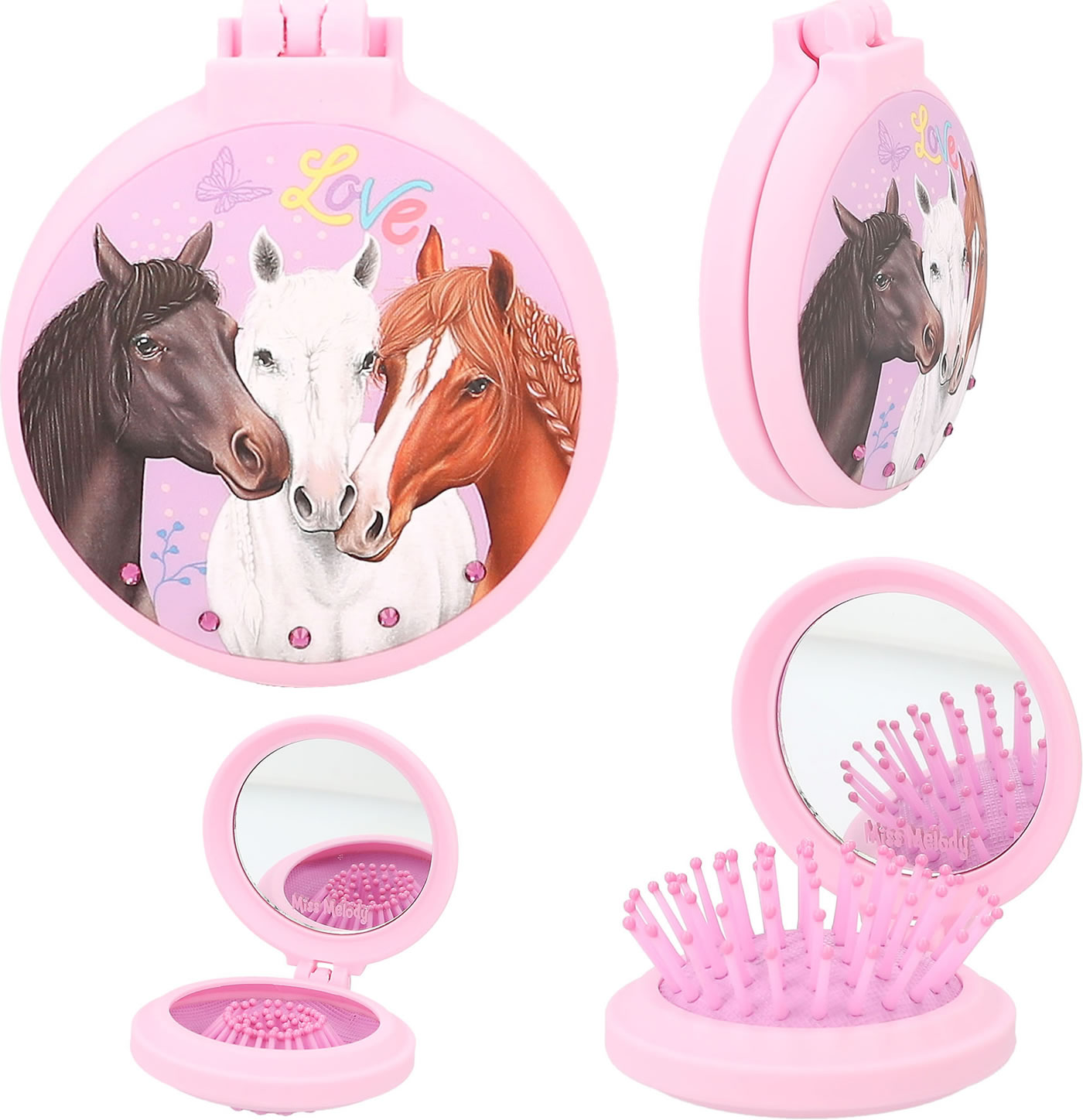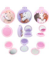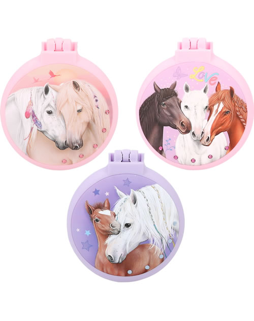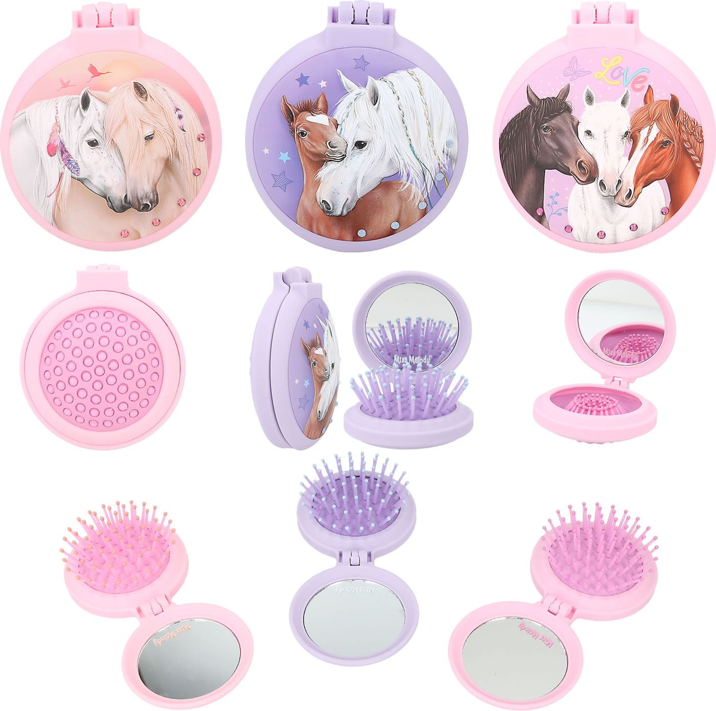 Für ponytastisch gekämmte Haare: Die runden Klapphaarbürsten von Miss Melody haben eine gummierte Oberfläche für eine coole Optik mit Soft-Touch. Innen mit Spiegel, außen mit tollen Pferde-Motiven und Strass-Steinchen.