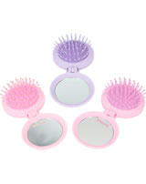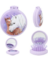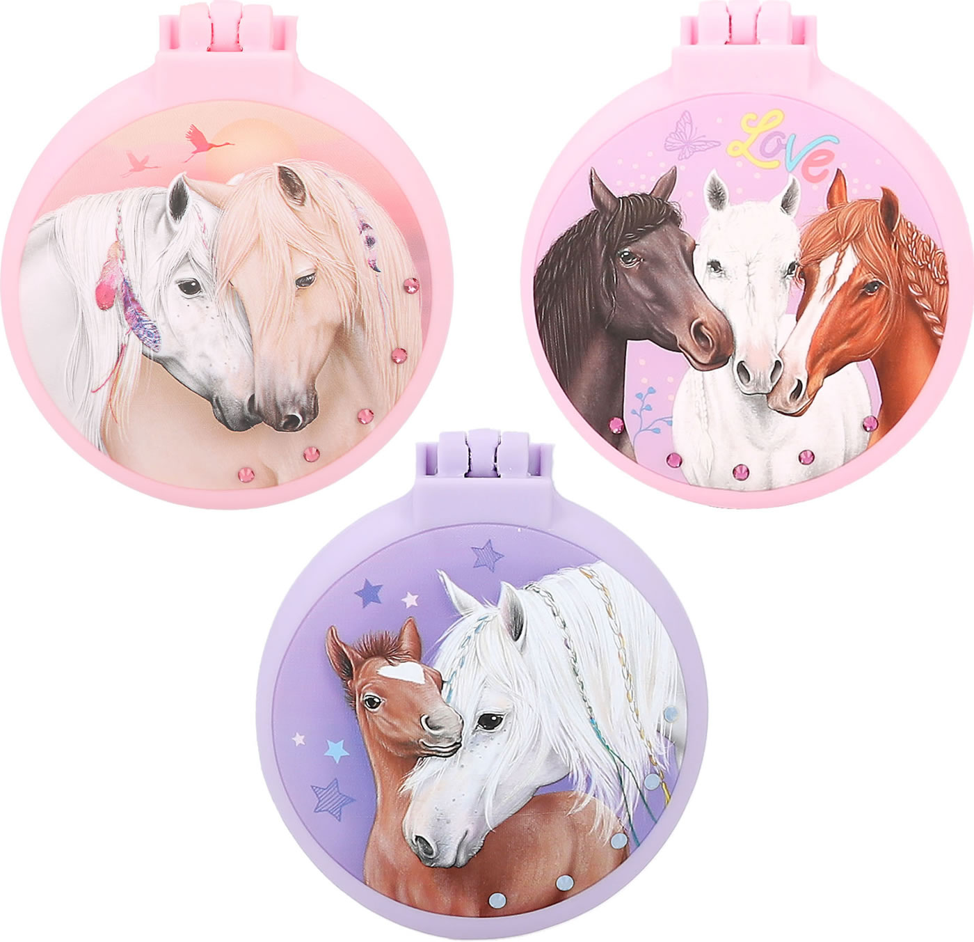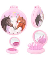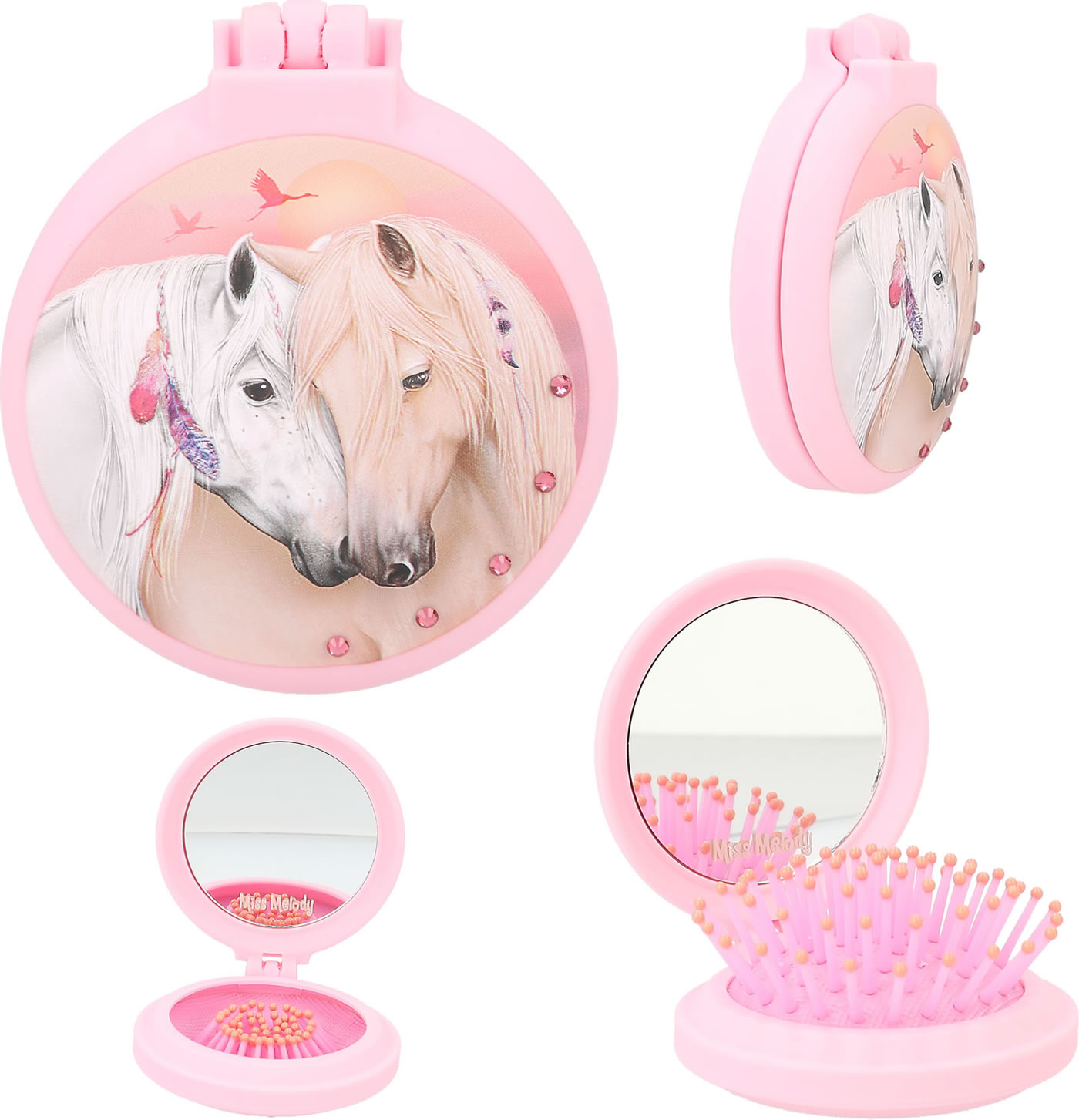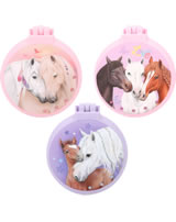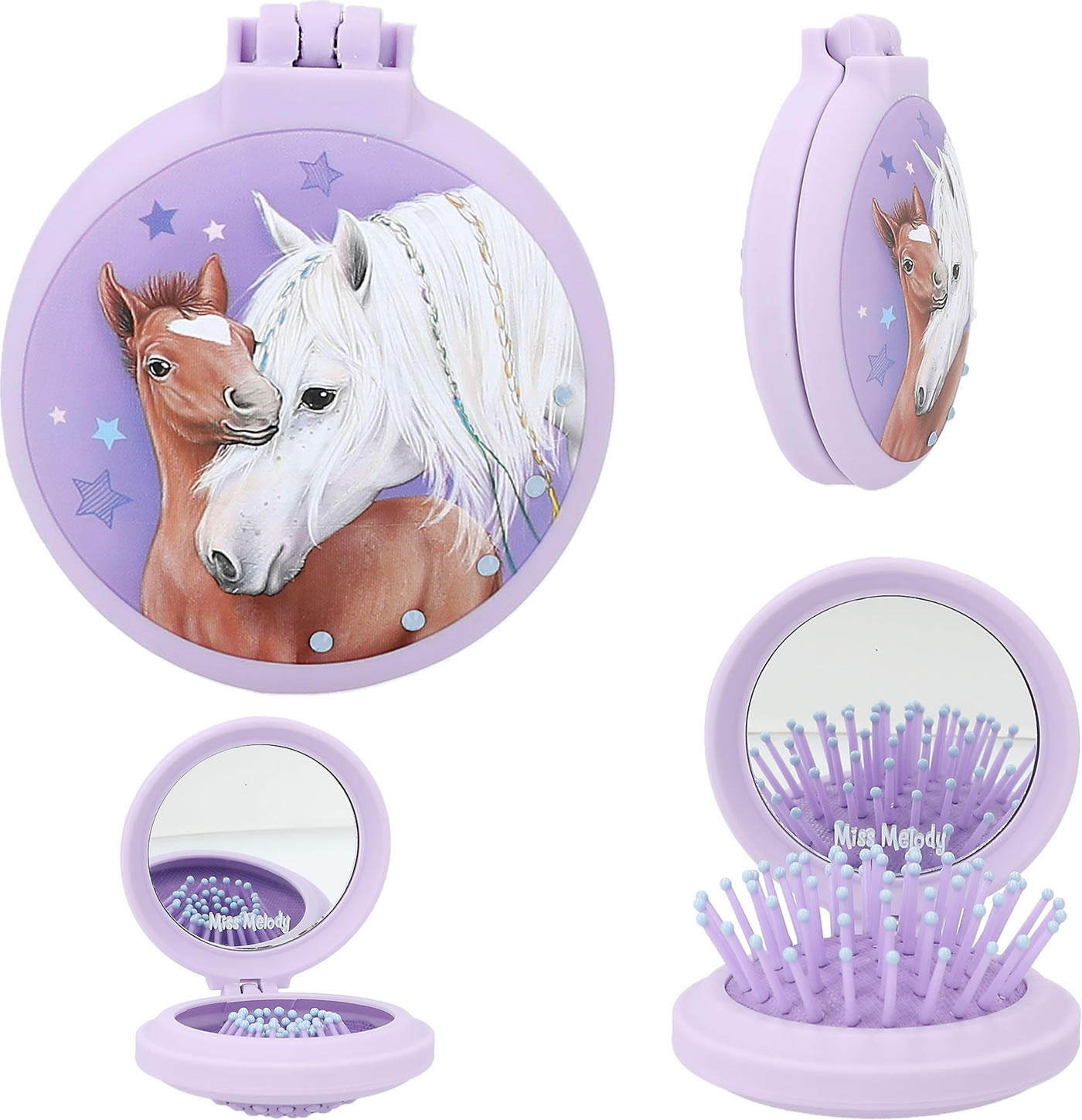 Für ponytastisch gekämmte Haare: Die runden Klapphaarbürsten von Miss Melody haben eine gummierte Oberfläche für eine coole Optik mit Soft-Touch. Innen mit Spiegel, außen mit tollen Pferde-Motiven und Strass-Steinchen.