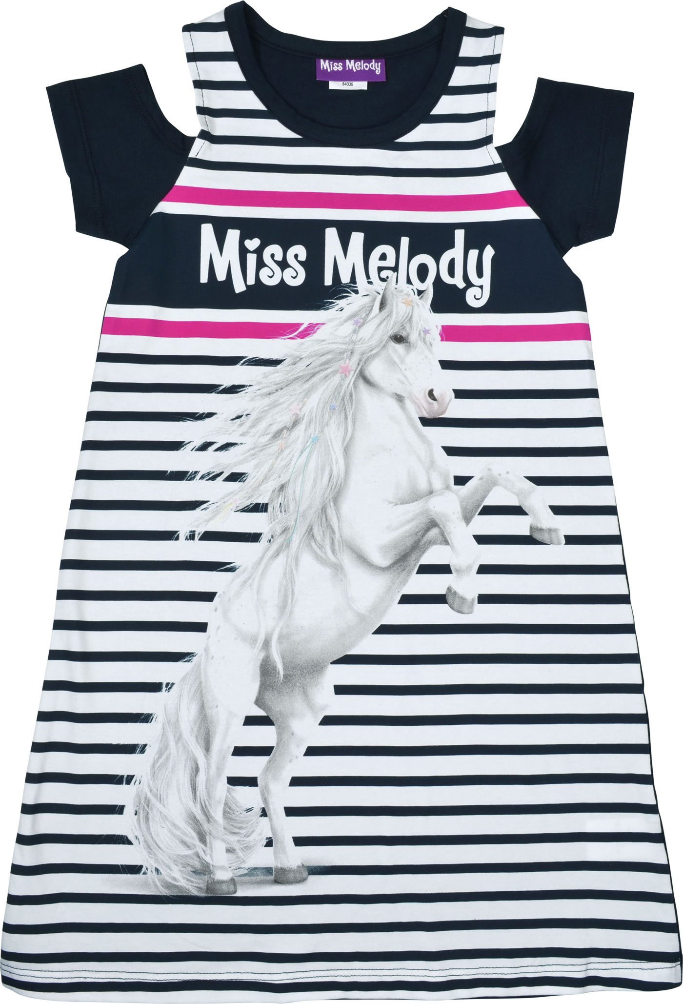 Der Schriftzug „Miss Melody“ glitzert. Das kurzärmlige Kleid ist schulterfrei.