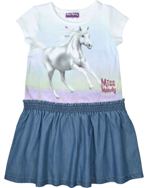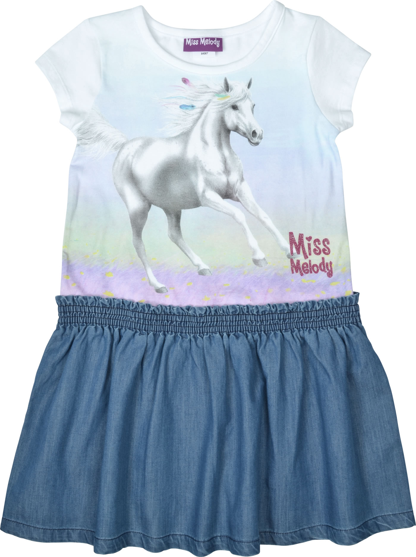 Hübsches Kleid mit kurzen Ärmeln in weiss von MISS MELODY mit tollem Pferde-Motiv auf der Vorderseite. Der Rock ist dunkelblau.