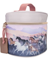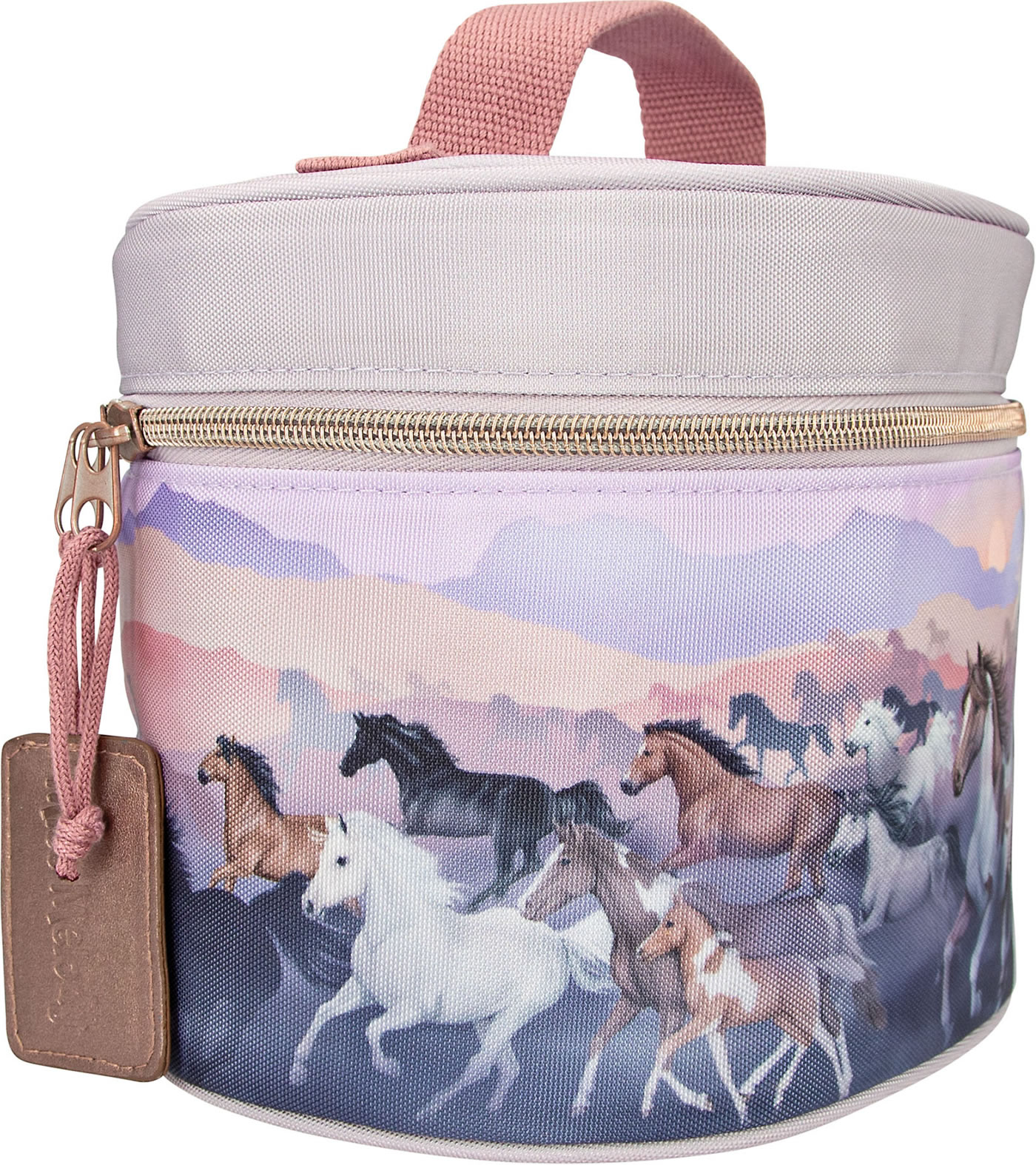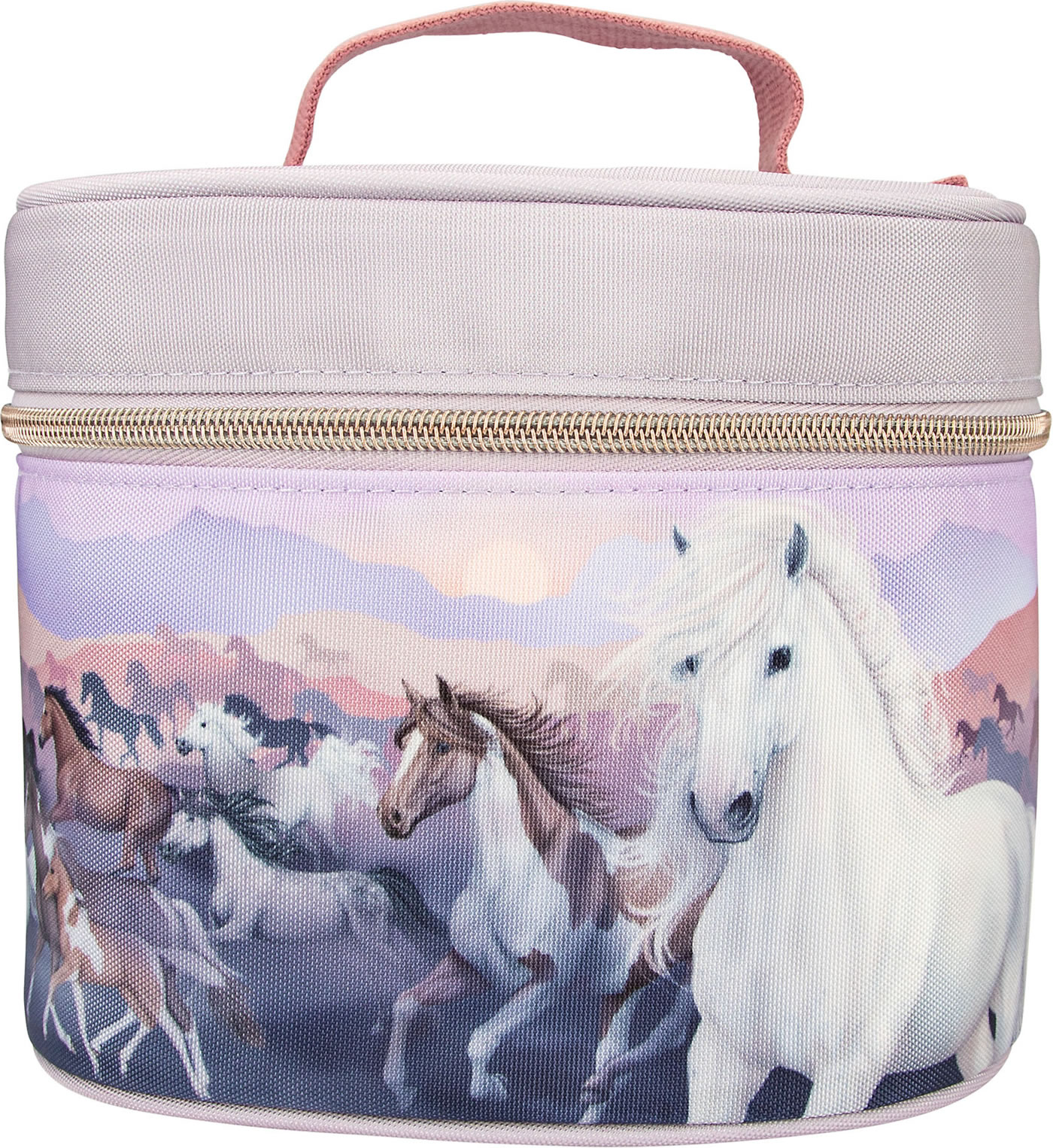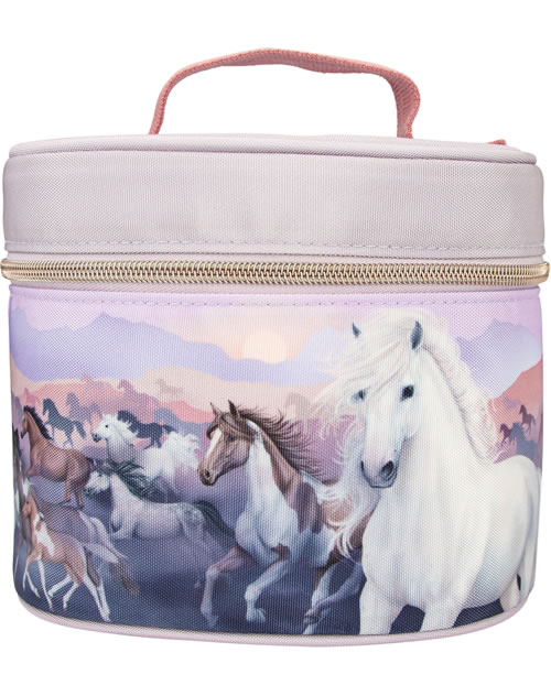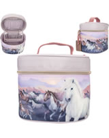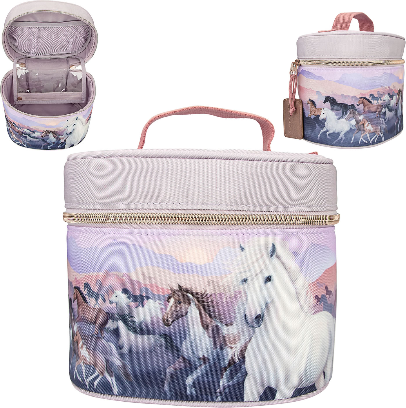 Traumhafte Pferde rundherum: Der Kosmetikkoffer von Miss Melody mit umlaufendem, wunderschönen Herden-Motiv vor einem stimmungsvollen Abendhimmel in Lila- und Mauve-Tönen hat einen praktischen Trage-Griff außen sowie eine Netztasche im Deckel und ein durchsichtiges Fach innen. Praktisch: der Spiegel-Anhänger!