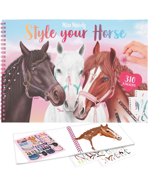 Mit dem spannenden Miss Melody Style your Horse Buch kannst Du Deine Lieblings-Pferde Pelly und Miss Melody nach deinem Gefallen stylen. Du kannst sie mit Glitzeraccessoires ausstatten oder mit tollen Medaillen und Schleifen. Du kannst die Seiten mit Stickern verzieren oder auch selbst bemalen.