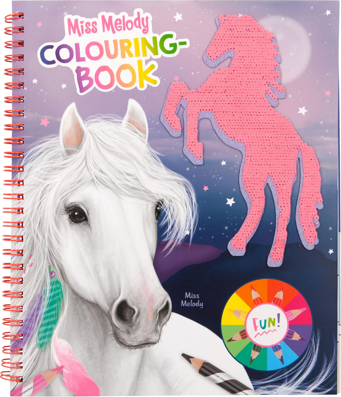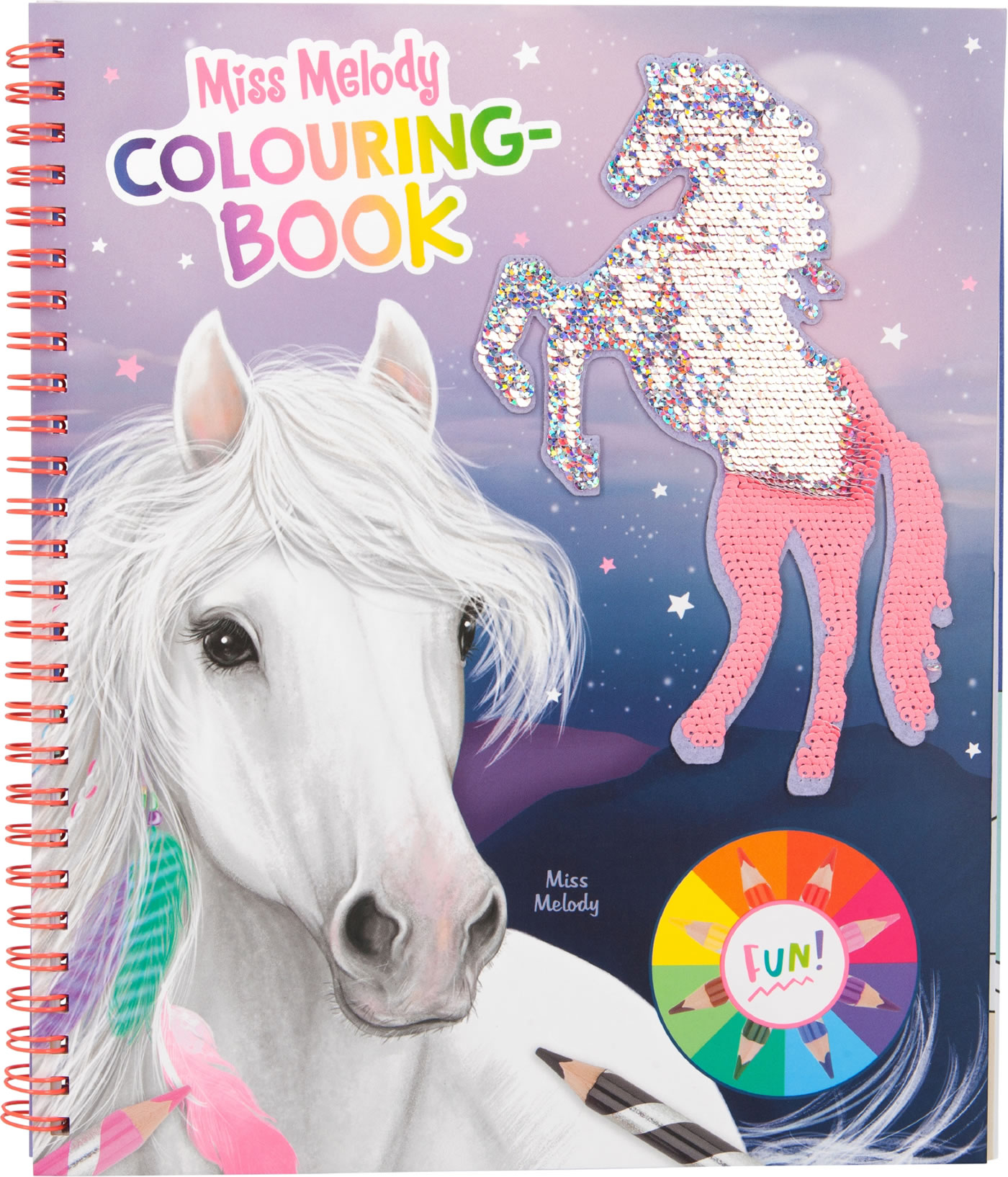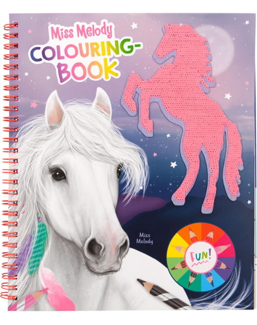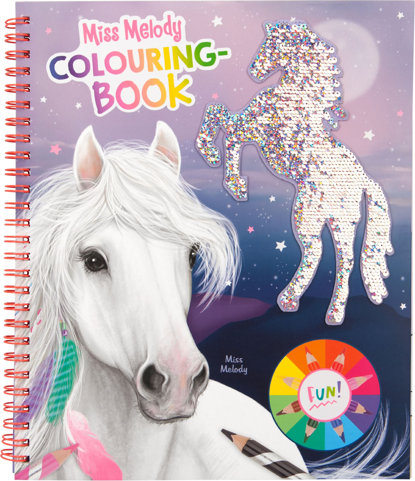 Ein schönes Malbuch. Die Motive sind wie immer toll! Die Miss Melody Malbücher mag meine Tochter am liebsten, weil die Abbildung der Pferde so toll sind und nicht albern aussehen. Durch die Streichpailletten vorne ein echter Hingucker und mal was anderes/besonderes