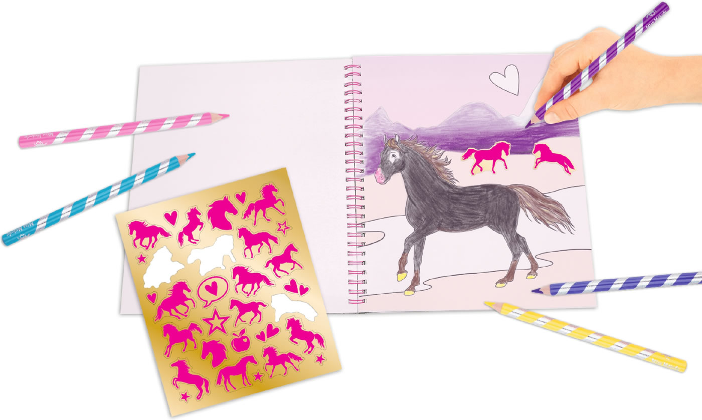 In diesem Malbuch findest du 20 tolle Pferdebilder zum Ausmalen. Ein Stickeerbogen ist auch dabei und das Pferd auf der Vorderseite besteht aus Streichpailletten, die wunderschöne Muster ergeben.