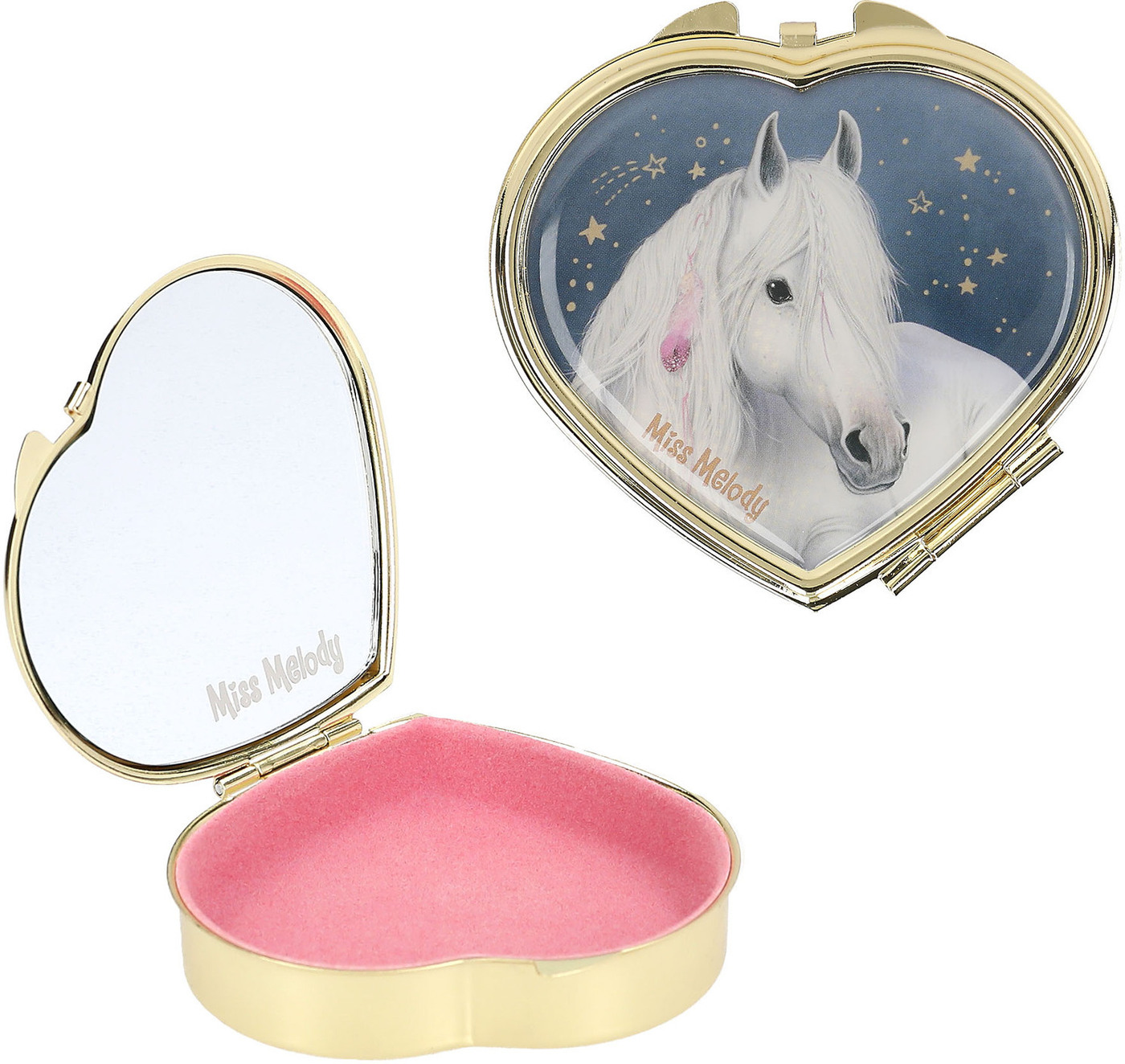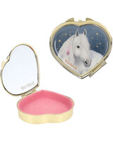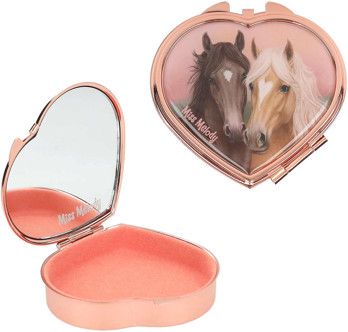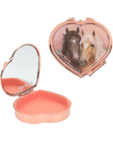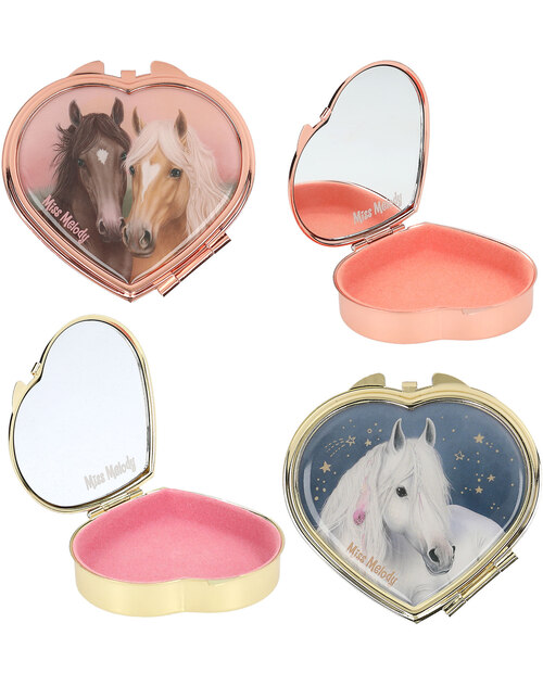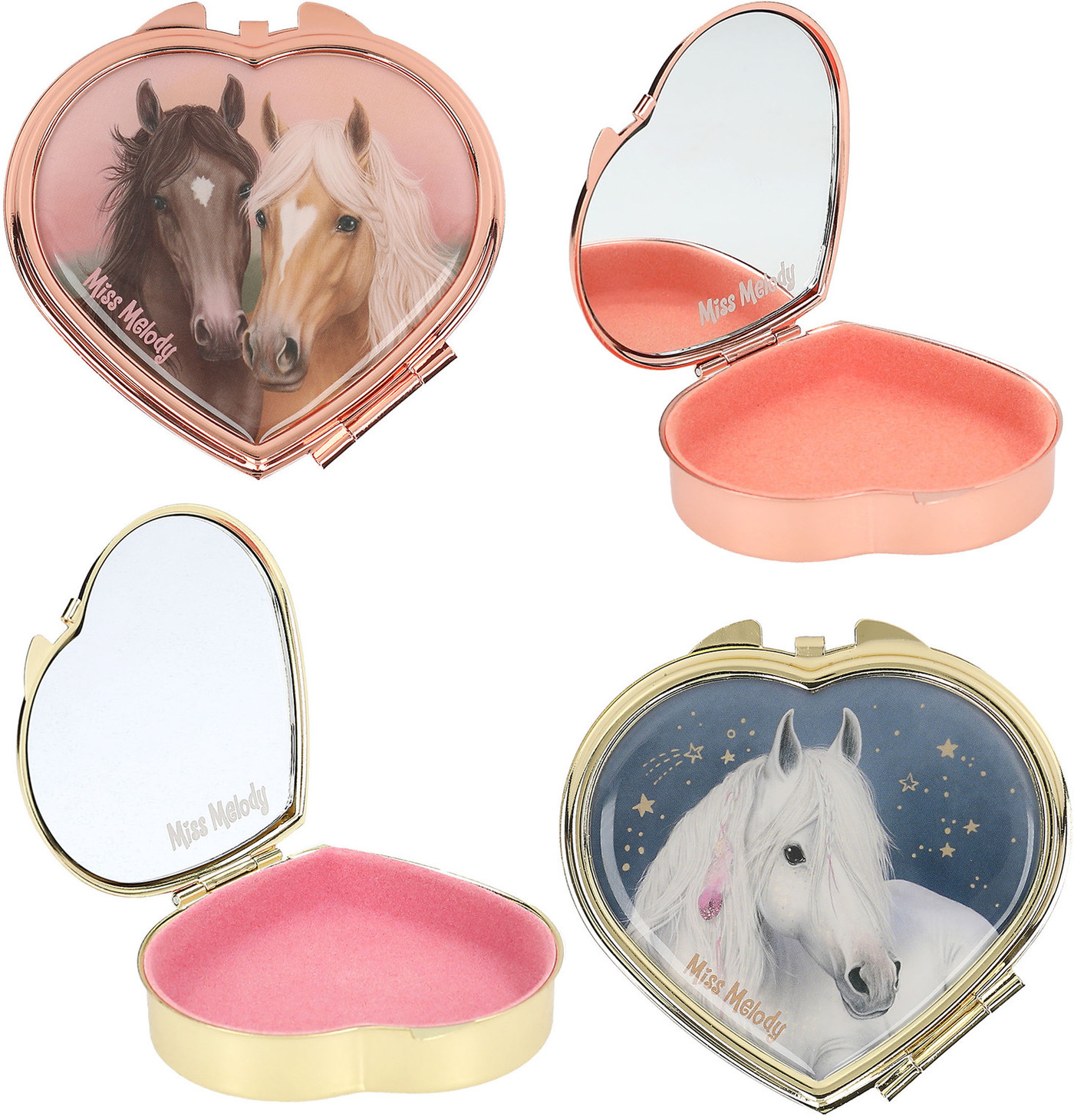 Die kleinen Metall-Döschen von Miss Melody in Herzform in Roségold und Gelbgold haben auf dem Deckel wunderschöne Pferde-Motive. Innen sind die Döschen samtig ausgekleidet und haben im Klappdeckel einen Spiegel.