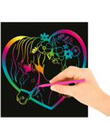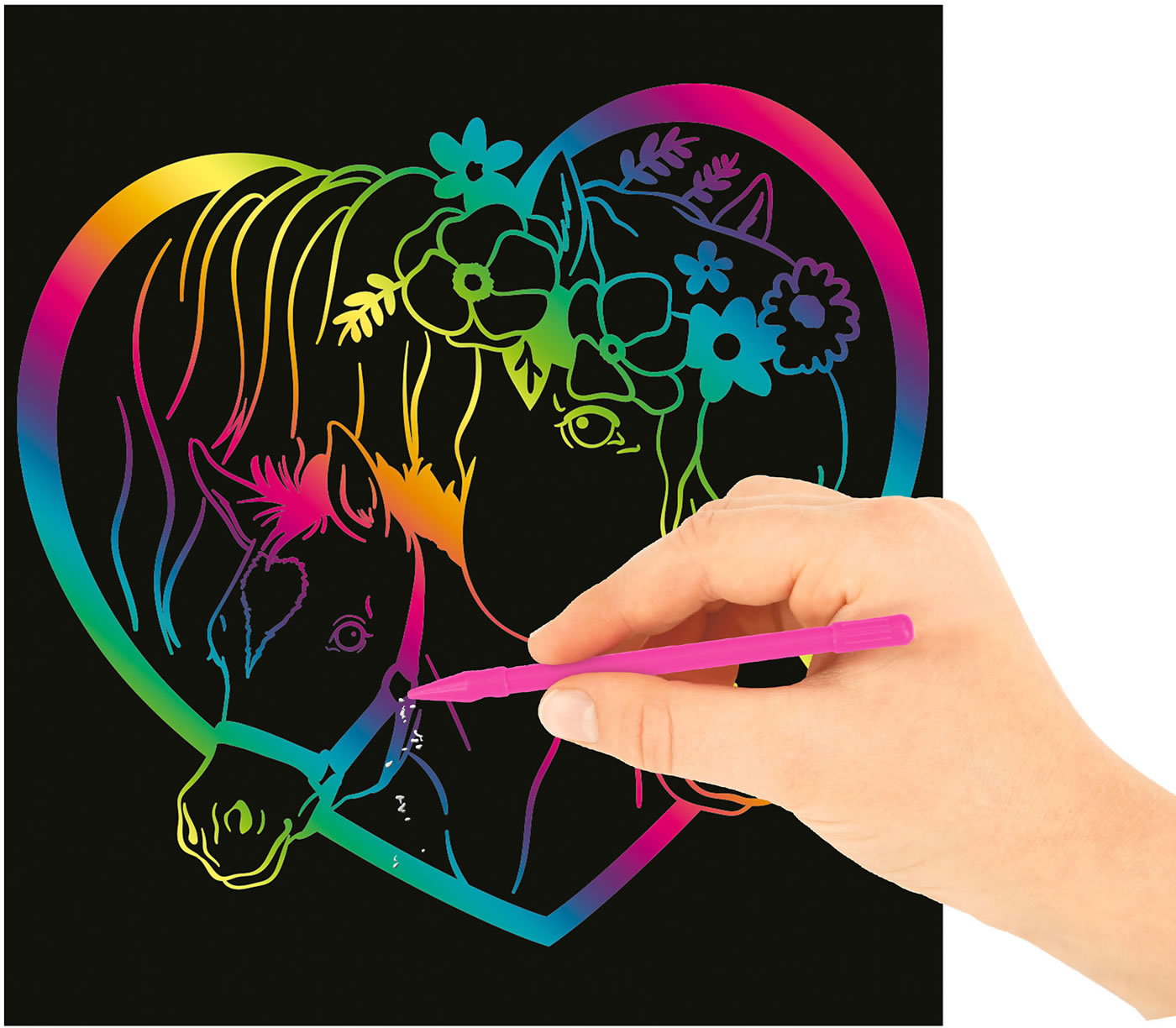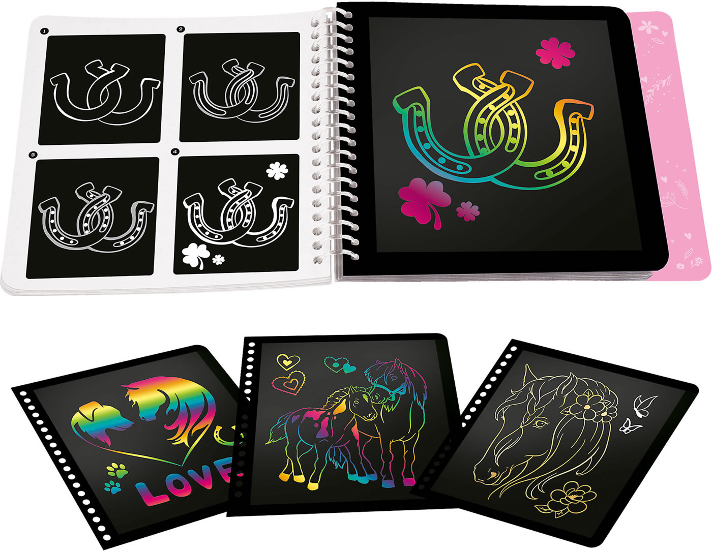 Pferde-Freunde aufgepasst! Hier kommt das coole Mini Magic Scratch Book von Miss Melody für kreative Kratz-Kunst. In diesem kleinen Büchlein verstecken sich die schönsten Bilder in den leuchtendsten Farben. 1 Plastikstift zum Freikratzen ist mit dabei. 14,0 x 15,3 cm