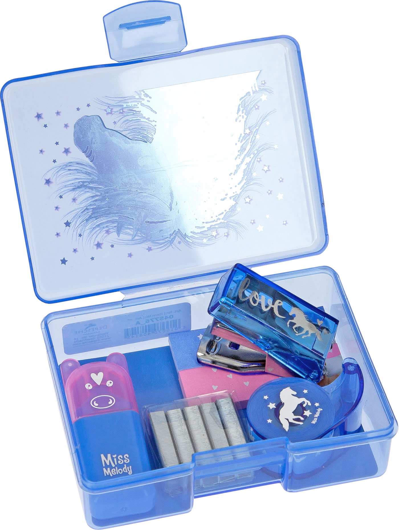 Inhalt: 1 Mini-Textmarker, 1 Mini-Pferde-Klebeband, 1 Tacker mit Tackernadeln, Haftnotizen