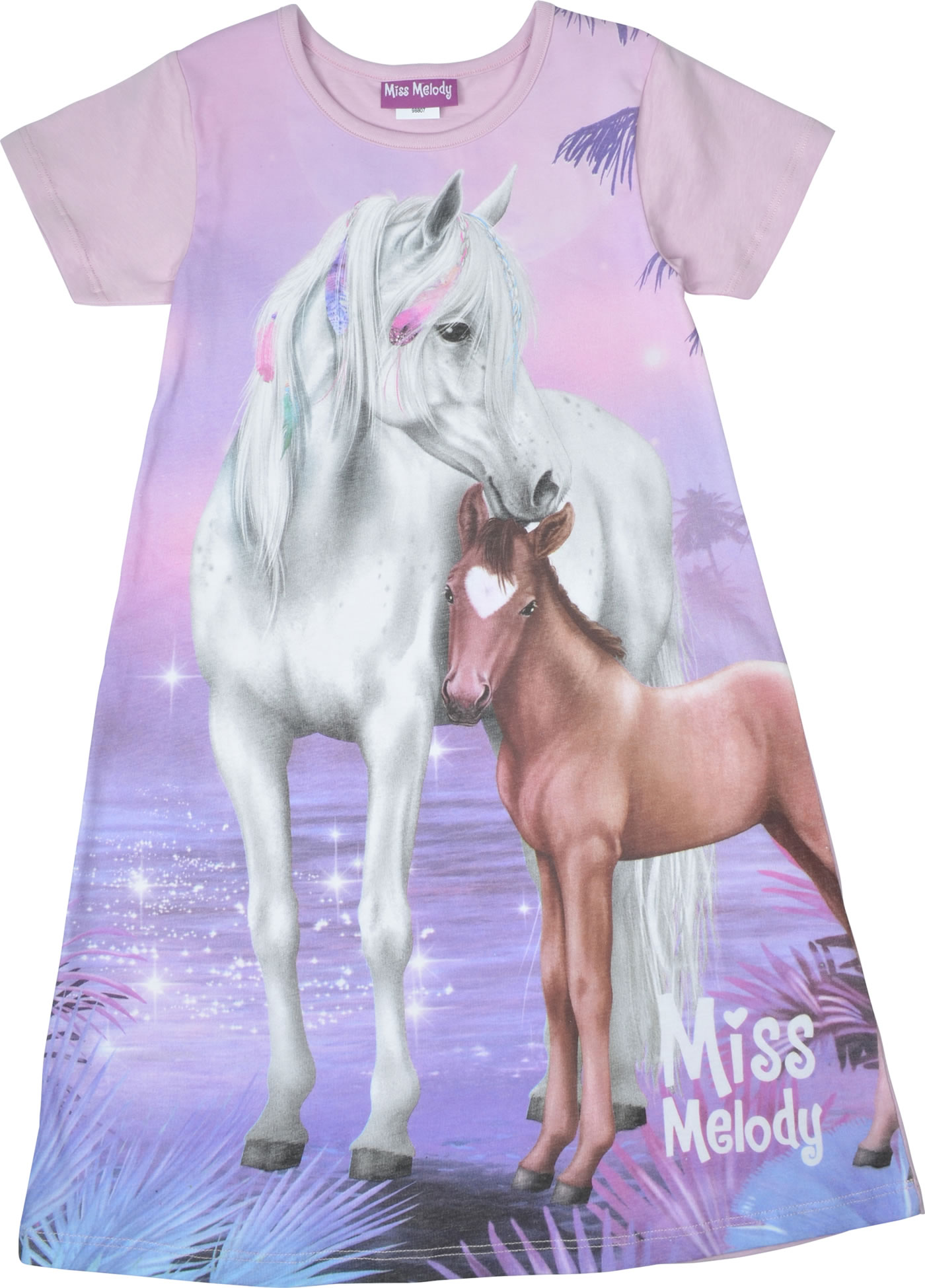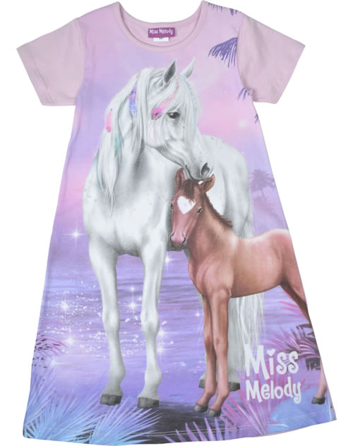 Hübsches Nachthemd mit kurzen Ärmeln in lila von MISS MELODY mit tollem Pferde-Motiv auf der Vorderseite.