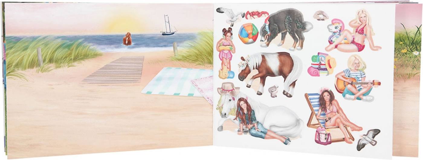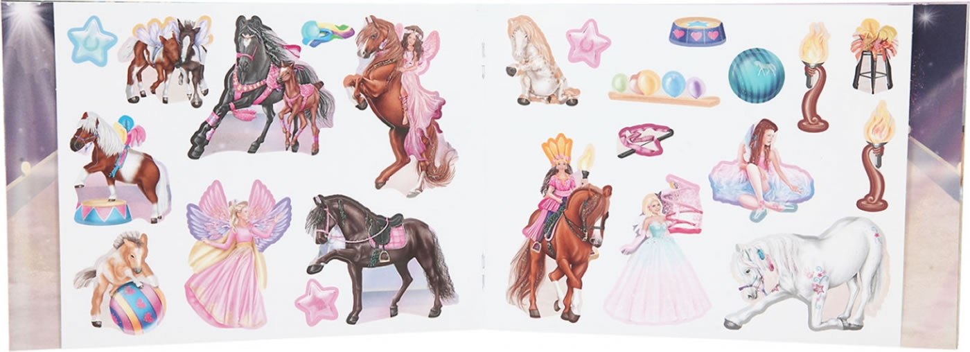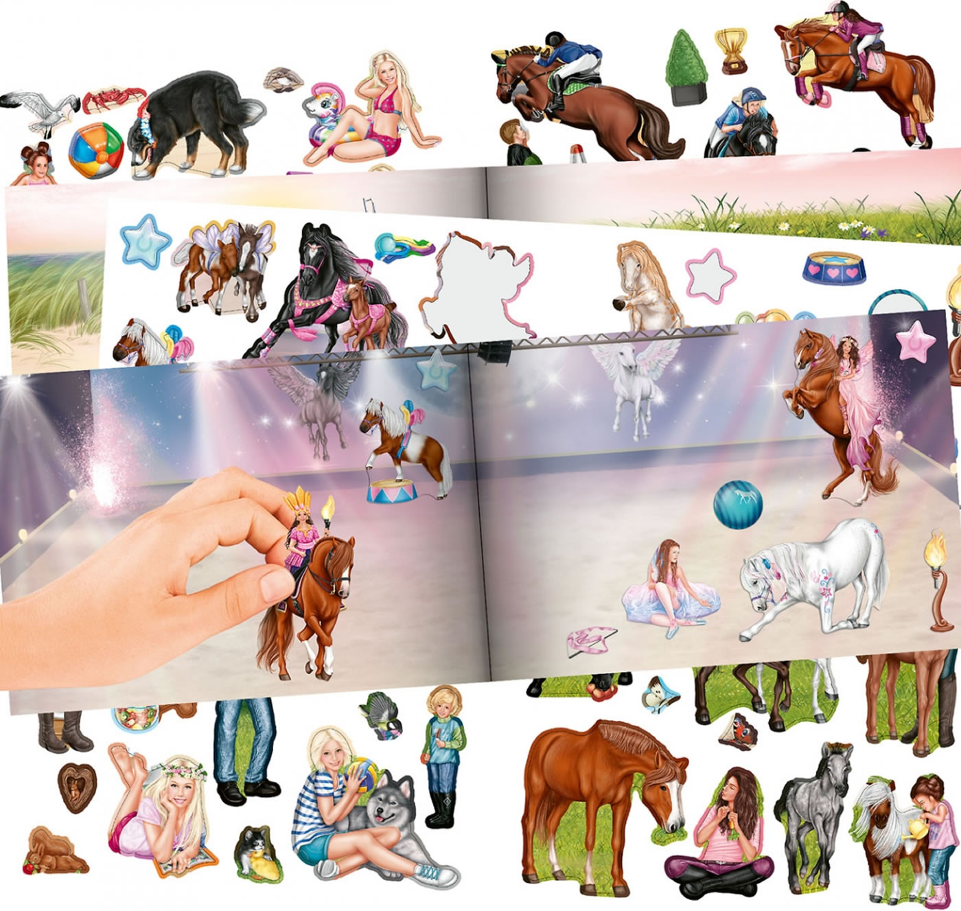 Mit vielen Stickern rund um Miss Melody, Sienna und ihren Freunden. Gestalte mit den Stickern den Reitparcours, den Pferdehof und die Ställe.