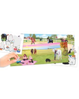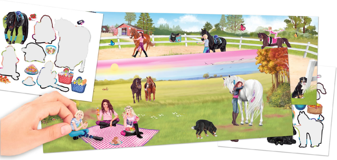 Mit vielen Stickern rund um Miss Melody, Sienna und ihren Freunden. Gestalte mit den Stickern den Reitparcours, den Pferdehof und die Ställe.