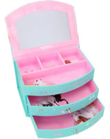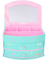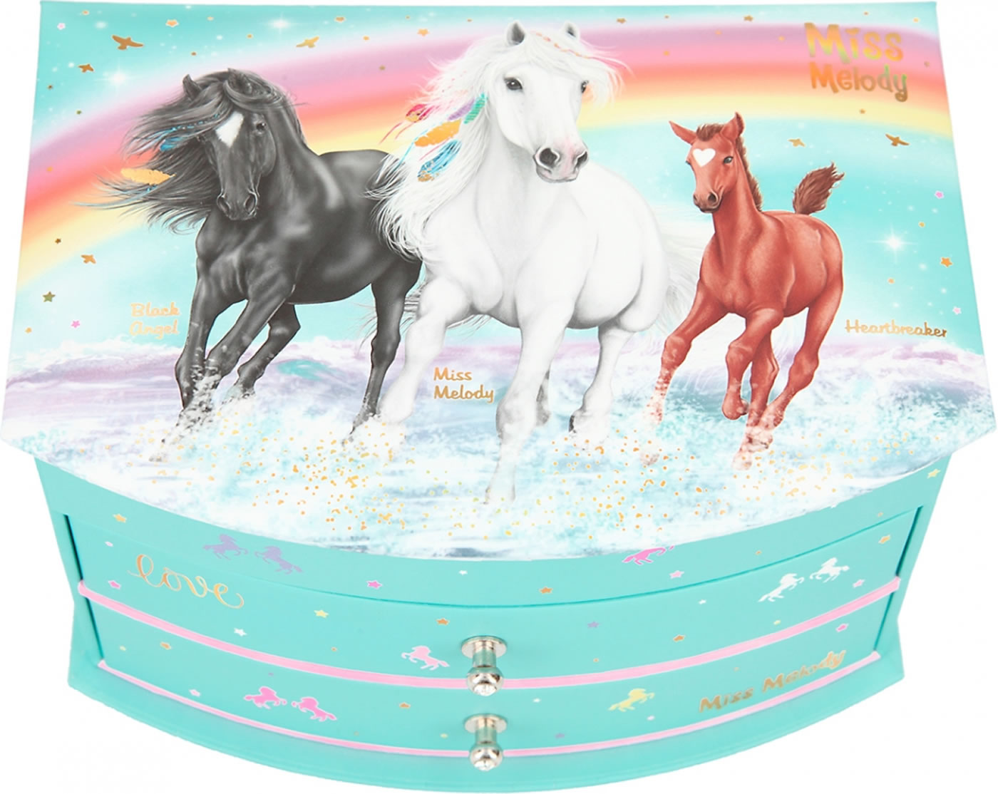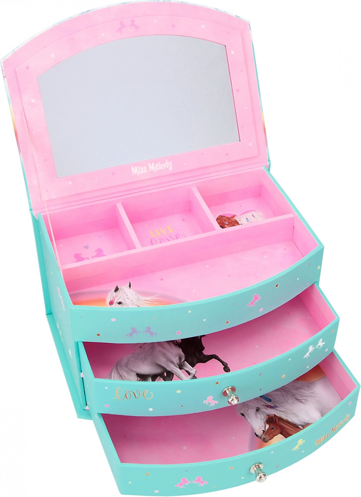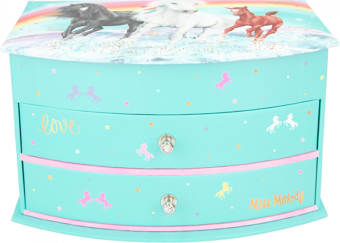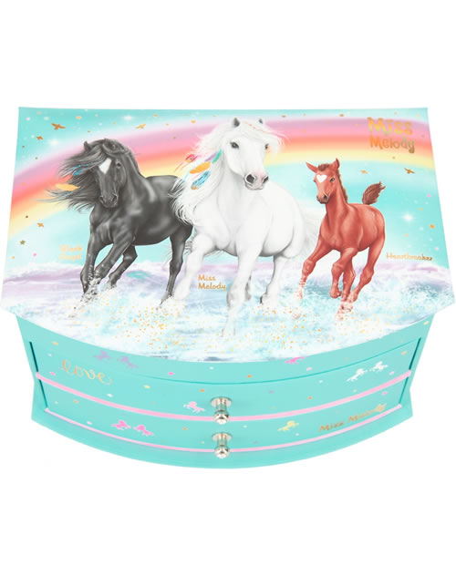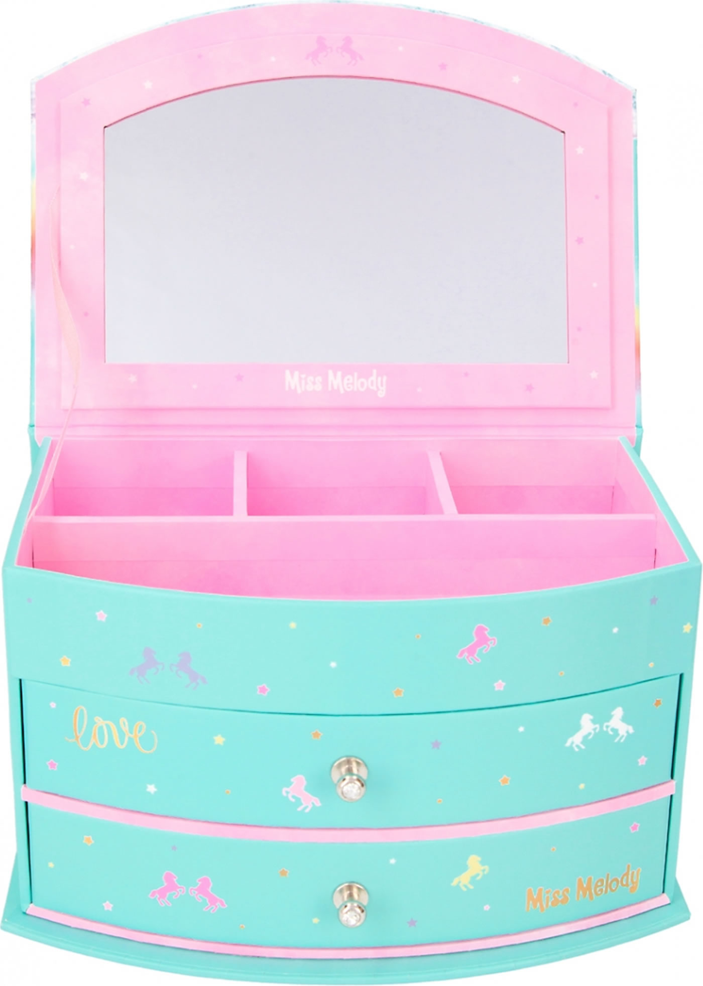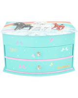 Für die großen und kleinen Schätze von Pferde-Fans: das türkise Schmuckkästchen von Miss Melody mit großem Pferdemotiv auf dem Klappdeckel! Es verfügt über ein praktisch aufgeteiltes Hauptfach sowie zwei Schubladen mit Strasssteinen auf den Griff-Knäufen.