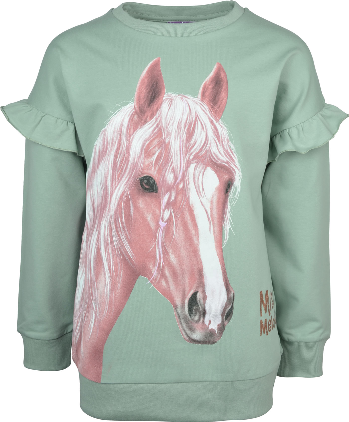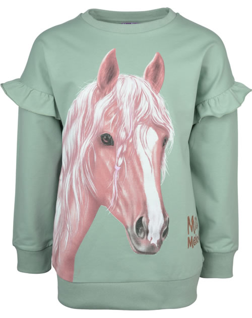 Wunderschönes grünes Sweatshirt von MISS MELODY mit spektakulärem Pferdemotiv auf der Vorderseite. Die Rüschenkante an den Ämeln geben dem Shirt eine feminine Note.