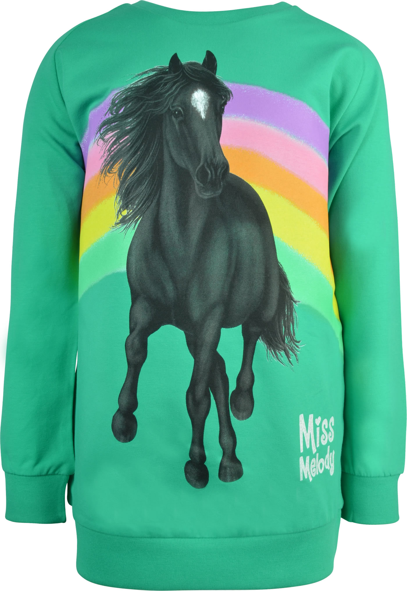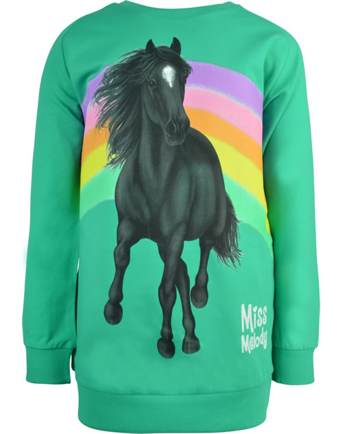 Wunderschönes grünes Sweatshirt von MISS MELODY mit spektakulärem Pferdemotiv auf der Vorderseite.