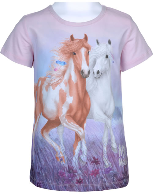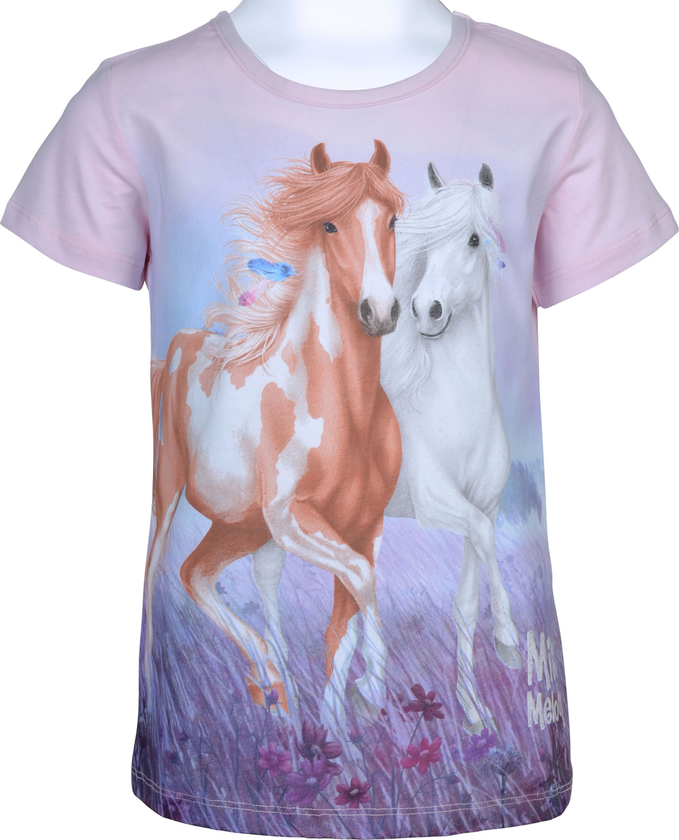 Hübsches T-Shirt in rosa von MISS MELODY mit tollem Pferde-Motiv auf der Vorderseite. Zusätzlich ist der Schriftzug „Miss Melody“ glitzernd gestaltet.