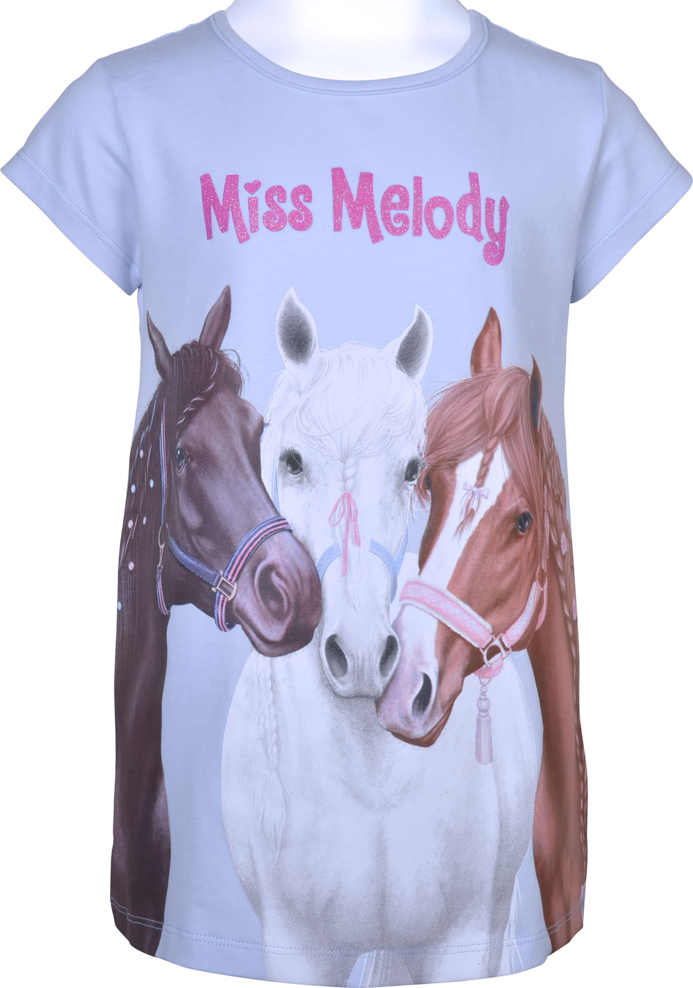 Hübsches T-Shirt in hellblau von MISS MELODY mit tollem Pferde-Motiv auf der Vorderseite. Zusätzlich ist der glitzernde Schriftzug „Miss Melody“ ein Hingucker.