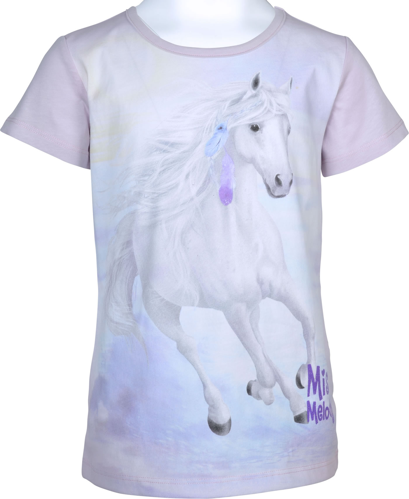 Hübsches T-Shirt in zartrosa von MISS MELODY mit tollem Pferde-Motiv auf der Vorderseite. Zusätzlich ist der Schriftzug „Miss Melody“ glitzernd gestaltet.